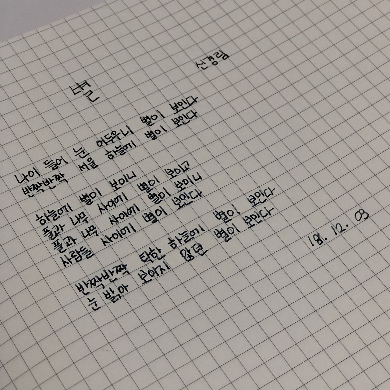 나이 들어 눈 어두우니 별이 보인다 반짝반짝 서울 하늘에 별이 보인다하늘에 별이 보이니 풀과 나무 사이에 별이 보이고 풀과 나무 사이에 별이 보이니사람들 사이에 별이 보인다반짝반짝 탁한 하늘에 별이 보인다눈 밝아 보이지 않던 별이 보인다