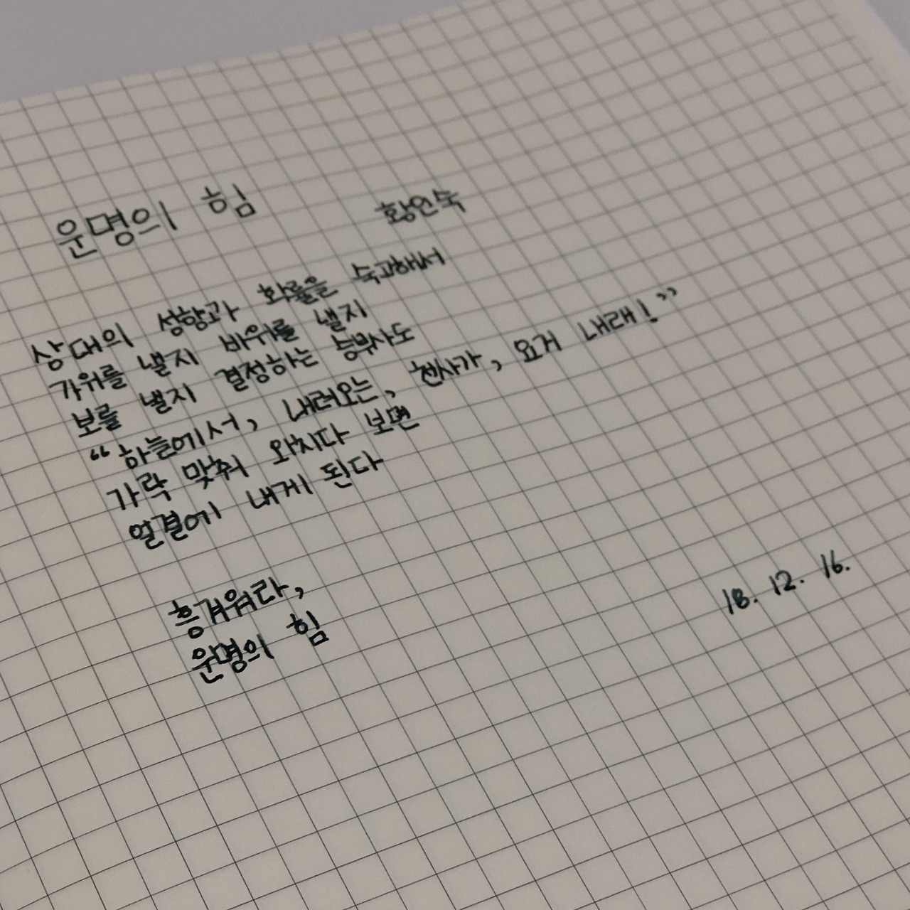 상대의 성향과 확률을 숙고해서 가위를 낼지 바위를 낼지 보를 낼지 결정하는 승부사도 "하늘에서, 내려오는, 천사가, 요거 내래!” 가락 맞춰 외치다 보면 얼결에 내게 된다 흥겨워라, 운명의 힘