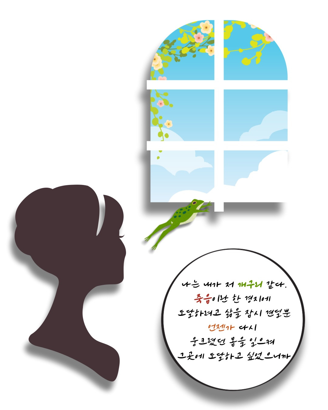 이 말을 다시 정리하면, 제가 정의했던 저의 개구리 같은 모습은 제가 설정한 제 한계였던 것입니다. 물론 그 한계 안에서 저는 안락함을 느꼈지만, 동시에 혼란을 느껴야 했습니다. 다른 사람들에게는 삶을 추천하면서도 나에게만큼은 죽음을 추천하는 모순에 놓여있었으니까요. 하지만 마침내 그 한계를 벗어나는 용기가 생겼을 때, 저는 비로소 모순된 정답이 아니라 공존하는 가능성을 느끼게 되었습니다.