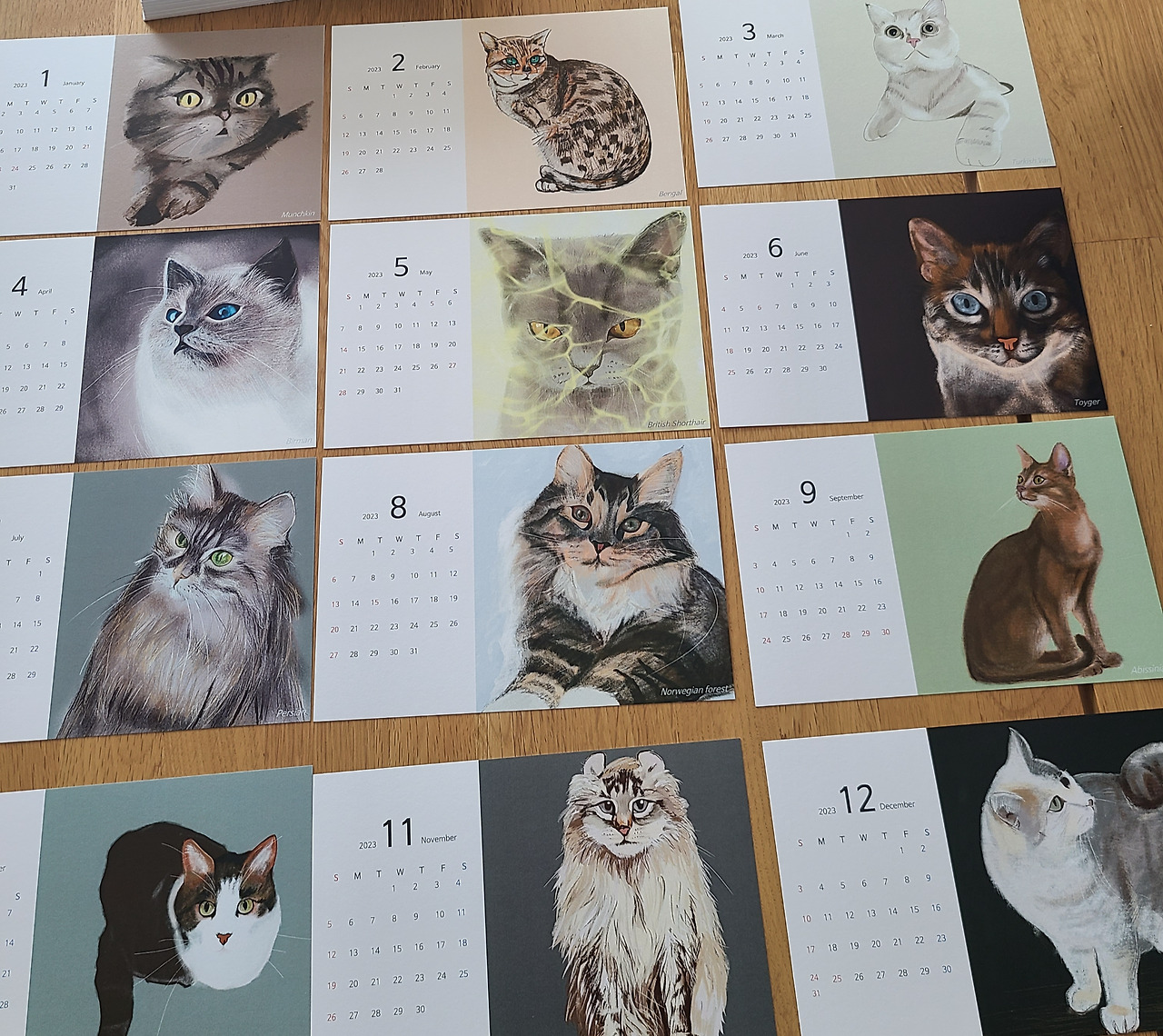 고양이 100마리 그리기를 도전하면서 중간 프로젝트로 2023년 캘린더를 만들어 보았습니다. 지인들에게 선물하기 위해 제작했는데 고양이에 관련된 글을 쓰는 이 공간에 조그만 이벤트를 하면 어떨까 하는 생각에 이렇게 올려봅니다. 구독자가 미미하고, 아직 시작하는 글이다 보니 많은 참여는 없을거라 여겨집니다만 ^^;;