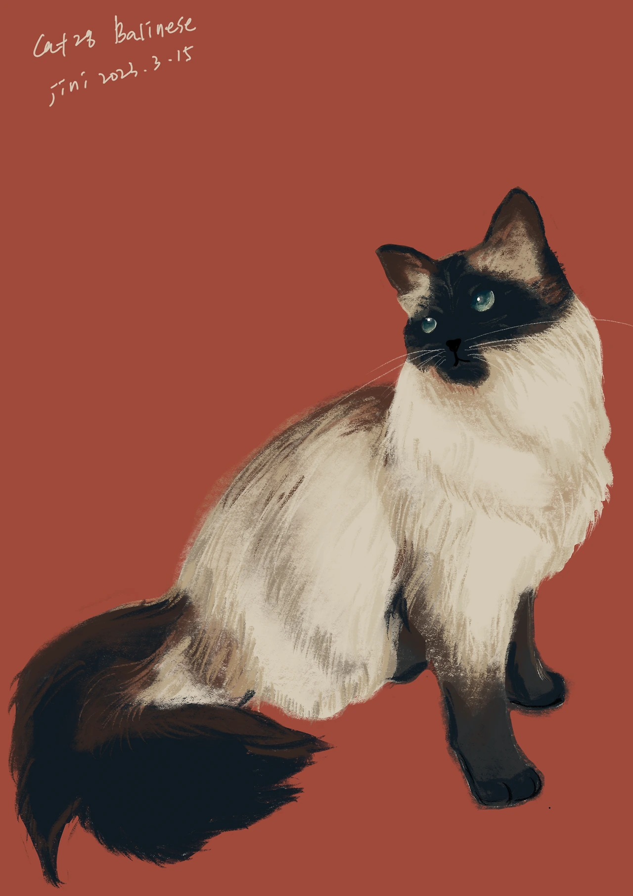 샴고양이와 닮았지만 긴털을 가진 발리니즈 풍성한 꼬리 긴 다리와 뾰족한 얼굴 생김새 부드러운 크림색 털 위에 에지 있는 검은 털이 얼굴과 꼬리 다리에 색감을 더해 우아하고 아름다운 고양이가 되었다. 푸른빛의 눈빛은 신비하고 매력적인 느낌이 든다.