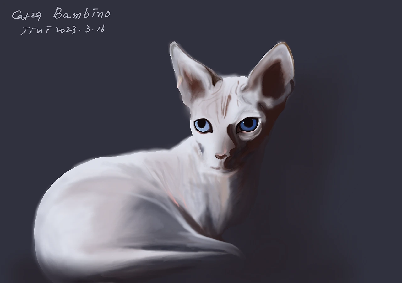 이탈리아어로 "Bambino"는 "baby"로 번역되는데, 고양이를 아기 고양이처럼 보이게 하는 모습을 가리킨다. 밤비노는 먼치킨에서 물려받은 짧은 다리와 크고 곧은 귀를 가지고 있으며, 스핑크스처럼 털이 없다.