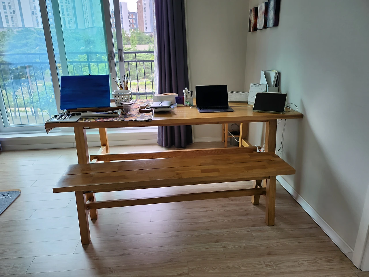 넓은 테이블에 손님들도 초대하고, 작업실이 될 때도 있고 식탁이 되기도 하는 등 다양하게 사용했지만 미니멀하게 살고 짐을 줄여 작은 곳으로 이사 가려고 생각하니 이게 짐이다. 마땅히 둘 곳이 여의치 않게 되어버렸다.