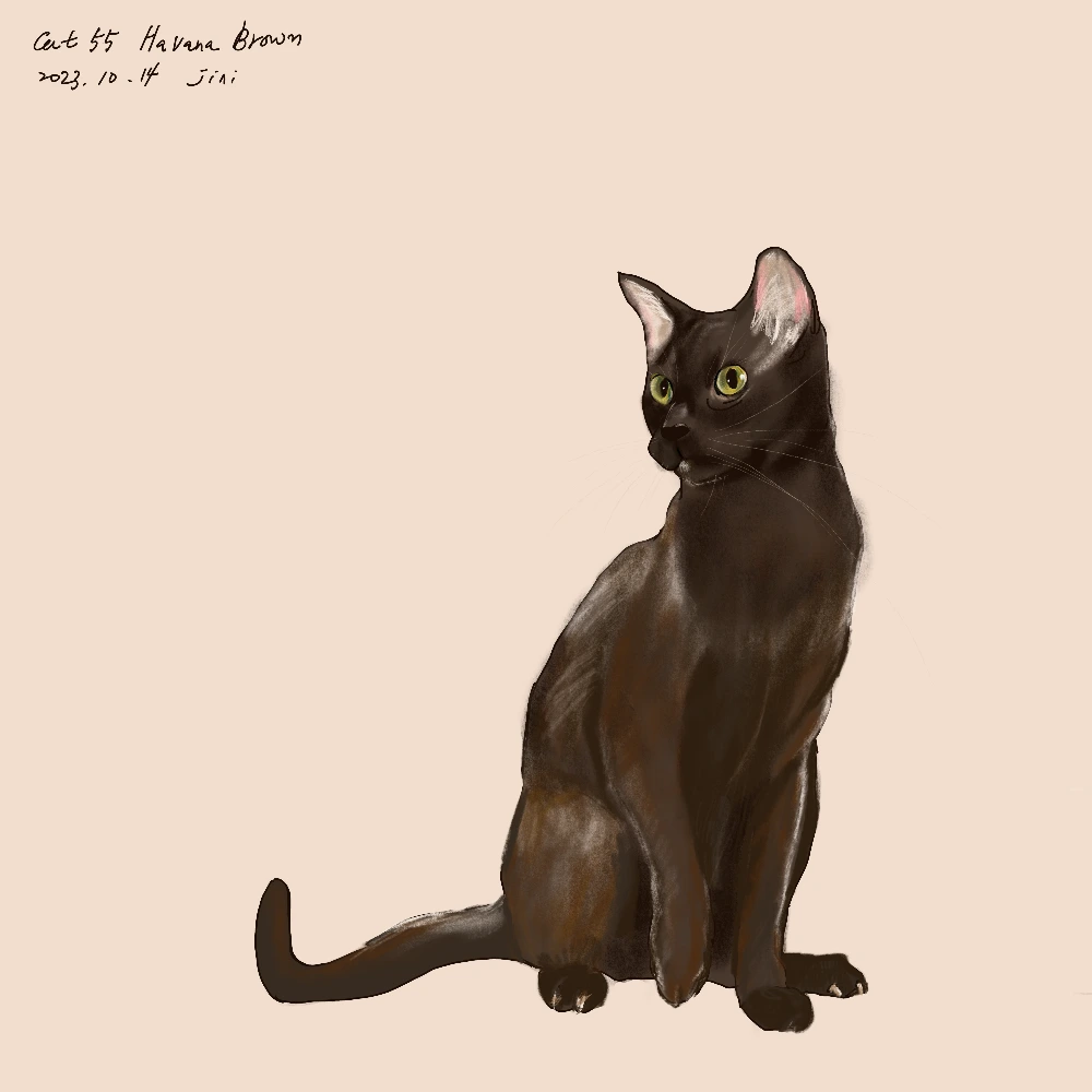 윤기 나는 브라운 털색에 입 쪽에 하얀 털이 점처럼 난 녀석이다. 발끝 포인트가 우아한 고양이의 제스처가 그대로 드러난다