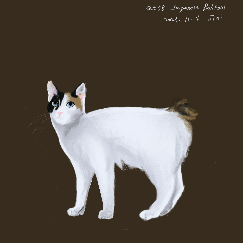 여러 고양이를 그리면서 밥테일 고양이들이 깔끔하게 떨어지는 외양을 가진 듯 보인다. 무수한 밥테일이 많은 것은 사람들이 좋아하는 유형이지 않을까 하는 생각이 든다. 짧은 꼬리 맑고 푸른빛의 눈 검정과 갈색의 무늬가 매력적인 아이다.