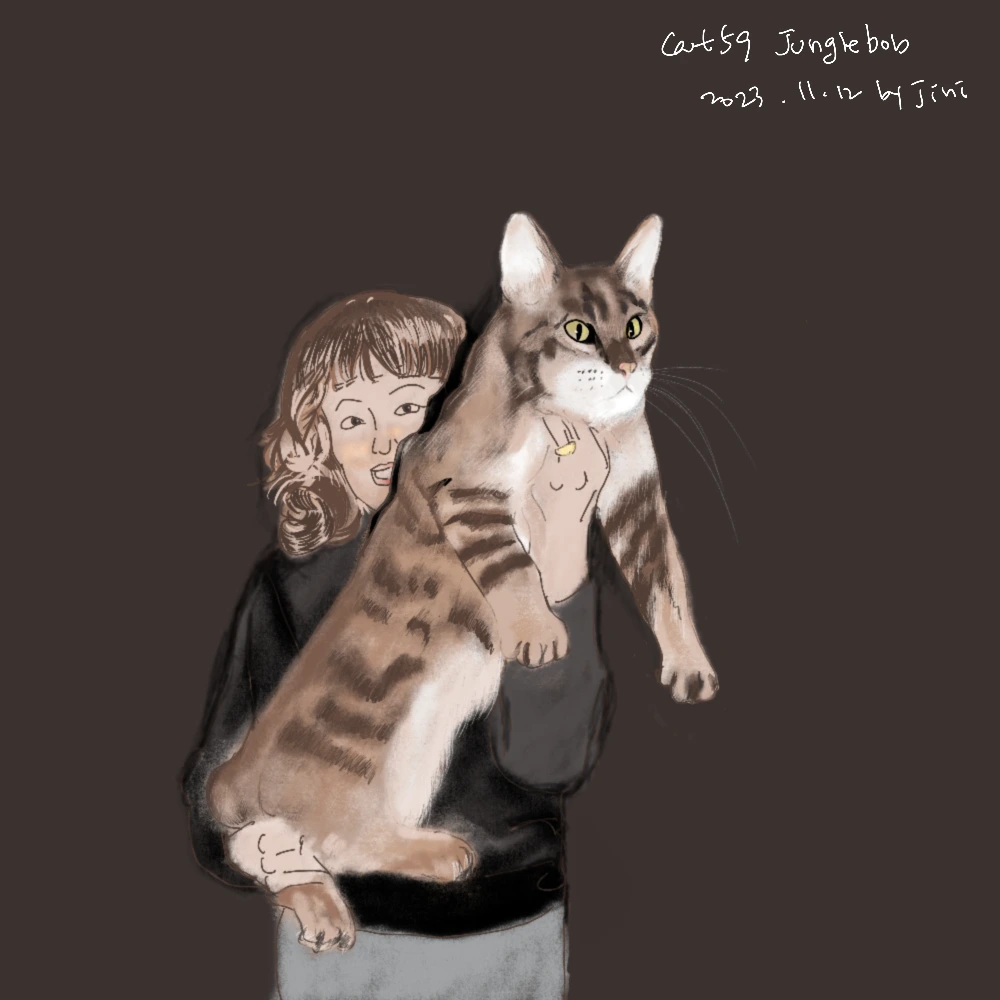 정글밥의 어마어마한 크기를 이 사진을 보고 알 수 있었다. 고양이가 이렇게 클 수 있구나 생각했는데 다른 사진을 구할 수 없기도 하고 정글밥의 크기를 보여주기에는 사람이 함께 들어간 모습도 괜찮을 듯하여 마무리해본다. 크기에 비해 놀란 듯 뚱한 표정이 귀엽다.