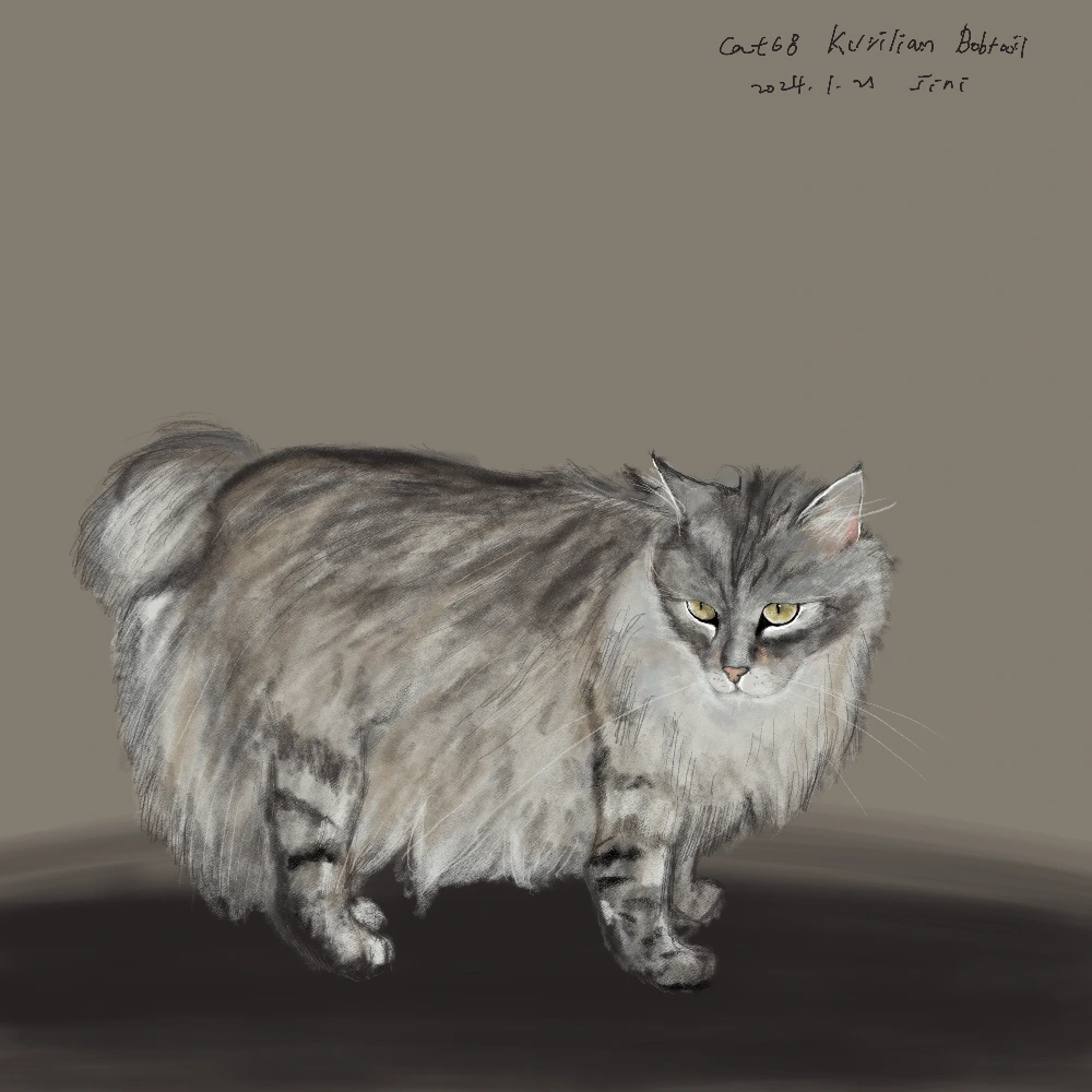 작은 사자 같은 느낌의 고양이다. 꼬리는 뭉툭하고 털은 갈퀴처럼 나 있다. 또렷한 아이라인 속의 눈매가 꽤 호전적이다.