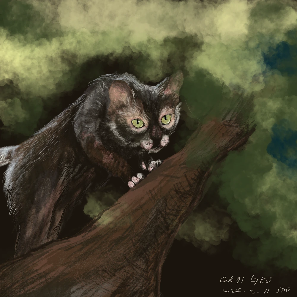 맹수처럼 보이는데 희귀한 고양이 중 하나라고 한다. 참조한 사진은 의자 위에서 디디고 선 모습이였지만 왠지 나무 위를 타고 다니는 듯한 모습이 어울릴듯하여 나무로 바꿔봤다.