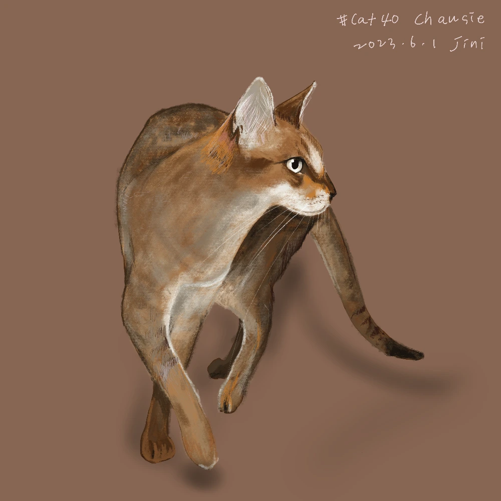 우아한 몸짓 가느다란 몸 선 아바나시안과 흡사 비슷해 보이는 외모인데 쵸시라는 귀여운 이름을 가진 녀석이다. 이름의 뜻은 귀여움과는 먼 정글이라는 의미를 가지고 있다 하니 야생고양이의 특질이 남아 있을 것 같다.