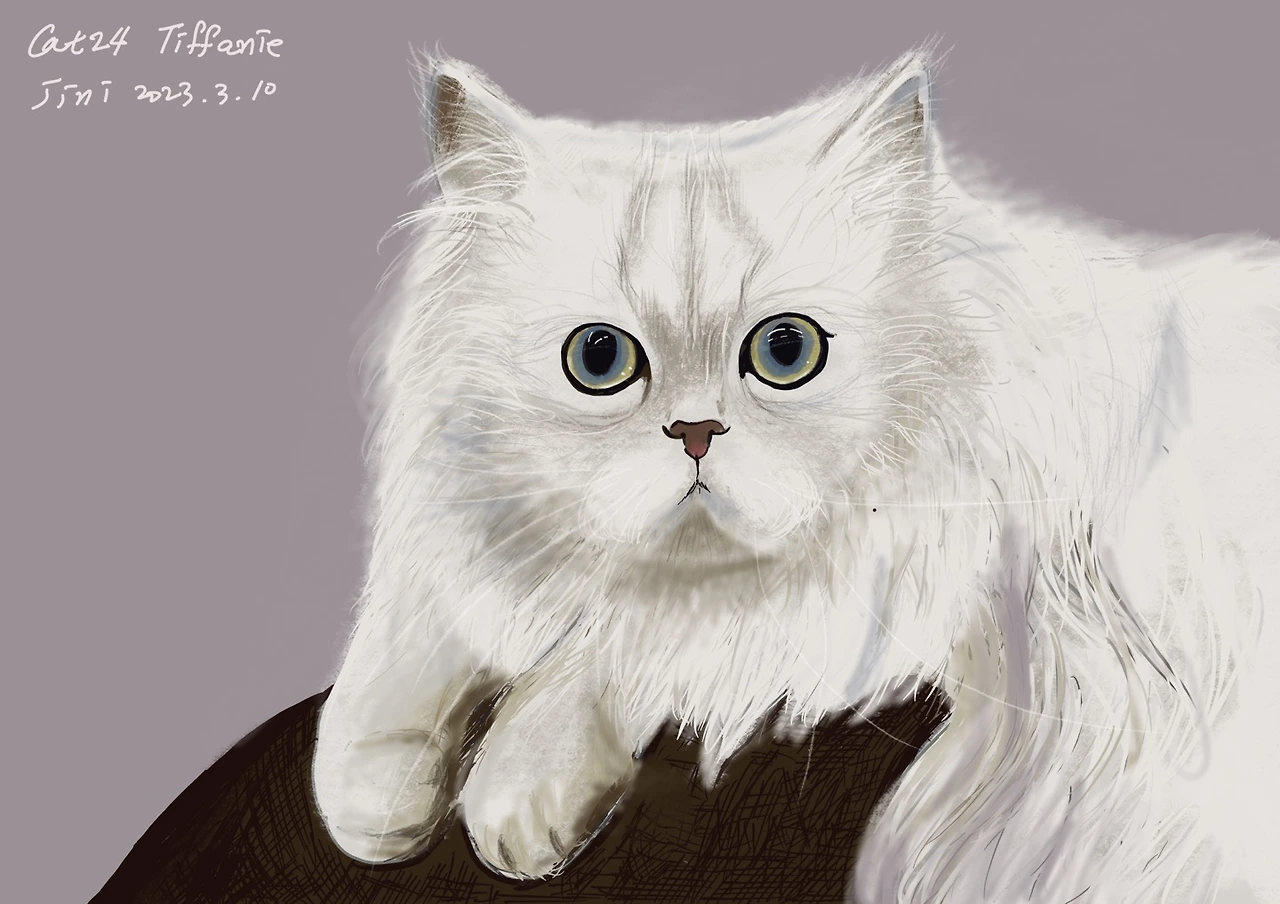 티파니라는 예쁜 이름에 걸맞게 참 예쁜 털을 가진 귀여운 고양이다. 동그란 눈을 말똥히 뜨고 사람 한 손에 잡히는 귀여운 녀석을 모델로 하여 그려봤다. 사람 손 대신 소파에 앉은 모습으로 변형해 봤는데 사진보다 약간 더 털찐이가 된 듯하다.