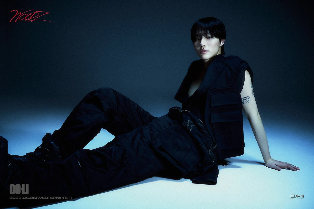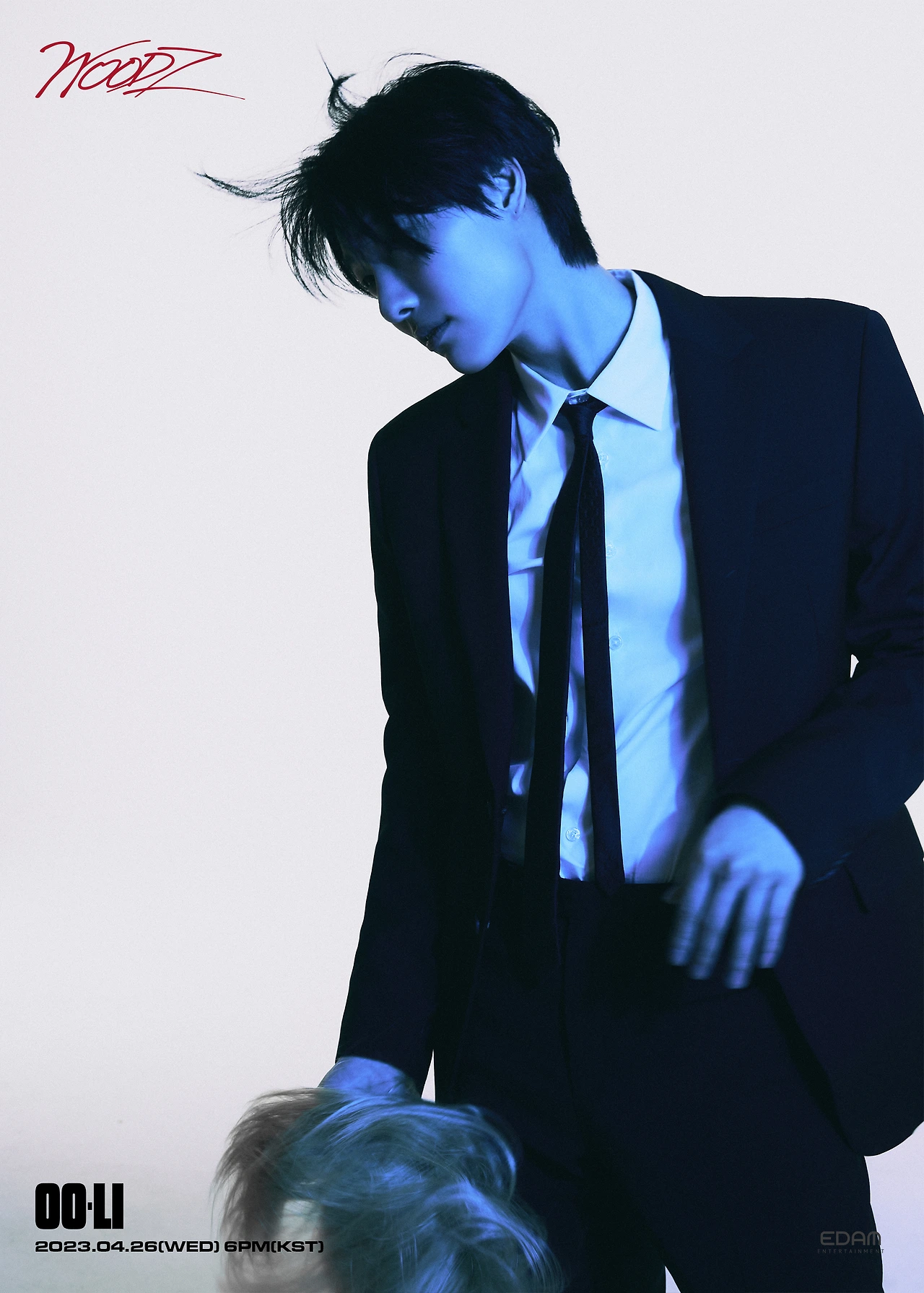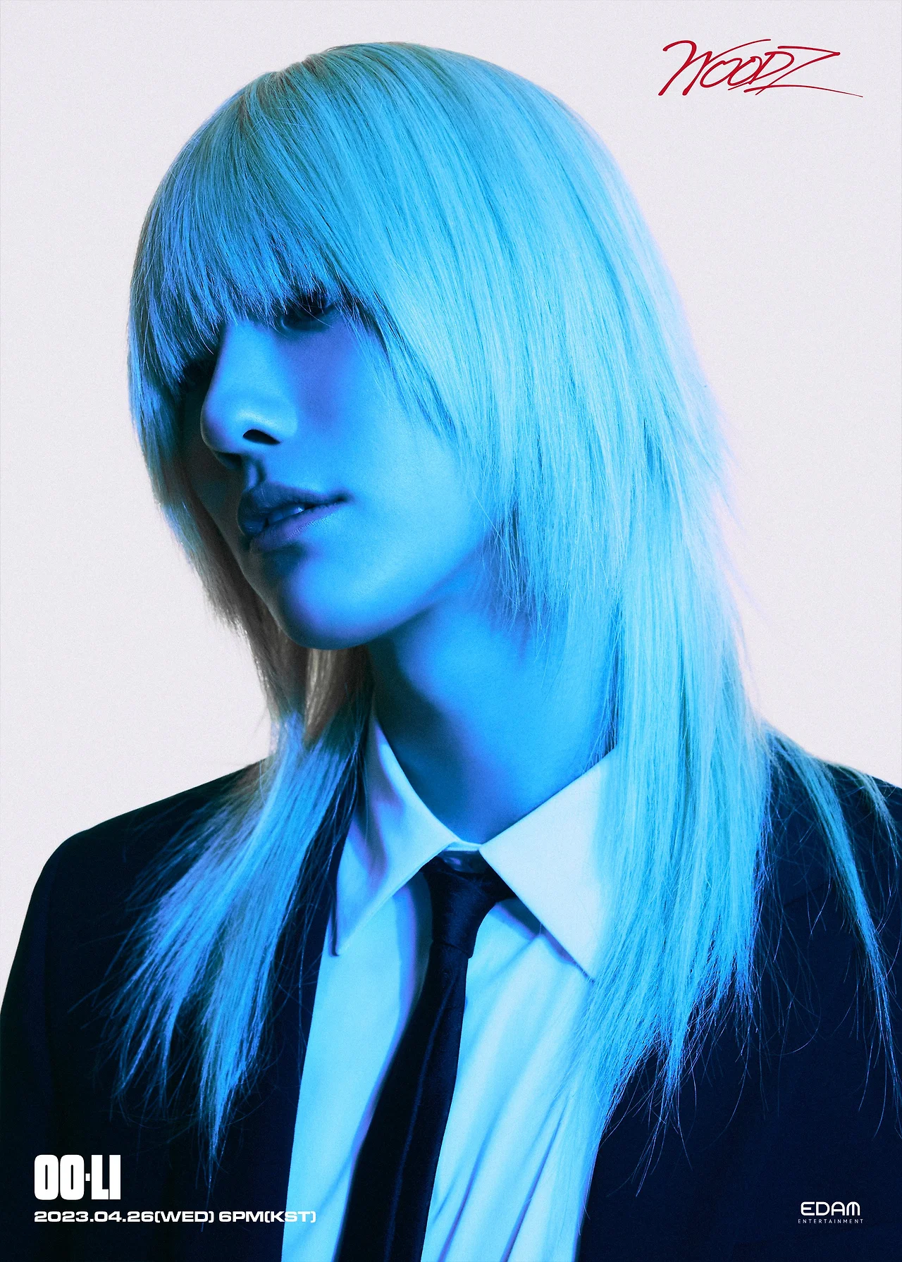 첫 공개된 [OO-LI] 앨범의 컨셉 티저 이미지에서 WOODZ는 베이직 수트와 금발의 가발을 매치해 파란 조명 앞에 섰다.