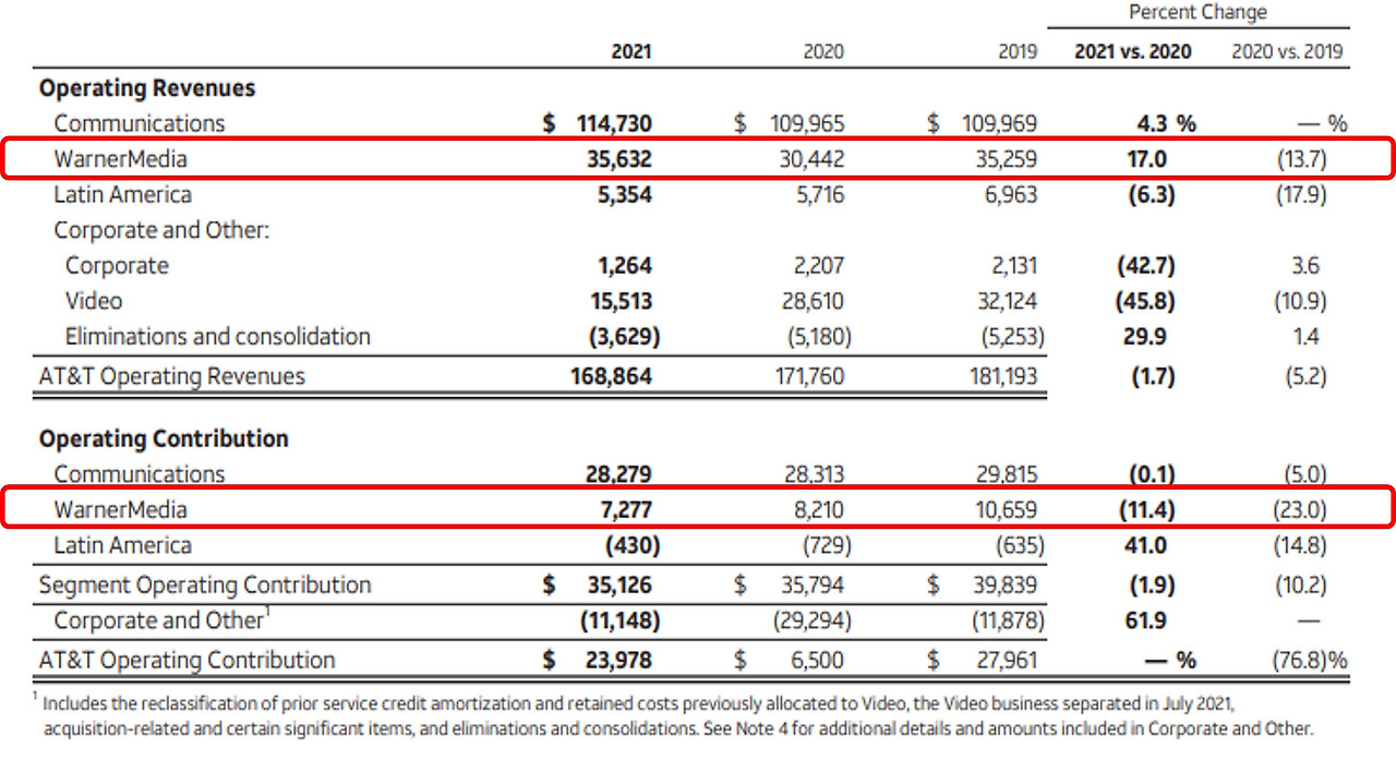 이번 합병은 워너미디어가 디스커버리에 합쳐진 형태다. 지분은 AT&T가 71%, 디스커버리가 29%를 보유하고 사업 운영은 디스커버리가 담당한다. 기존 워너미디어의 수입이 디스커버리보다 약 3배 많다는 점이 의아하다. 이러한 측면에서 생각해 보면 정말 AT&T의 워너미디어는 경제적으로 실패했기 때문에 디스커버리와의 합병을 고려한 것이라고 느껴지기도 한다. AT&T의 워너미디어는 왜 실패라는 평가를 받게 되었을까?