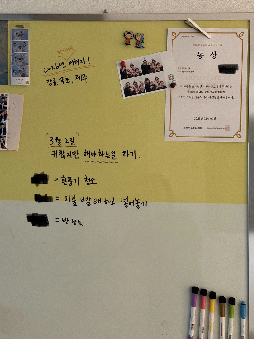 이 멋진 습관을 우리 집에 도입하고 싶었다. 와이프와 아들에게 화이트보드에 ‘귀찮지만 해야 하는 일’을 적어놓고 지켜보자 제안했다. 첫 번째 할 일로 난 화장실 환풍기 청소, 아내는 이불 빨래, 아들은 방 정리를 각각 적었다. 시각적으로 적어두니 몸이 진짜로 움직여졌다. 환풍기 청소는 뚜껑 분리부터 해야 해 상당히 귀찮다. 볼 때마다 해야지 해야지 하면서 두어 달을 미루다가, 드디어 오늘 성공했다.