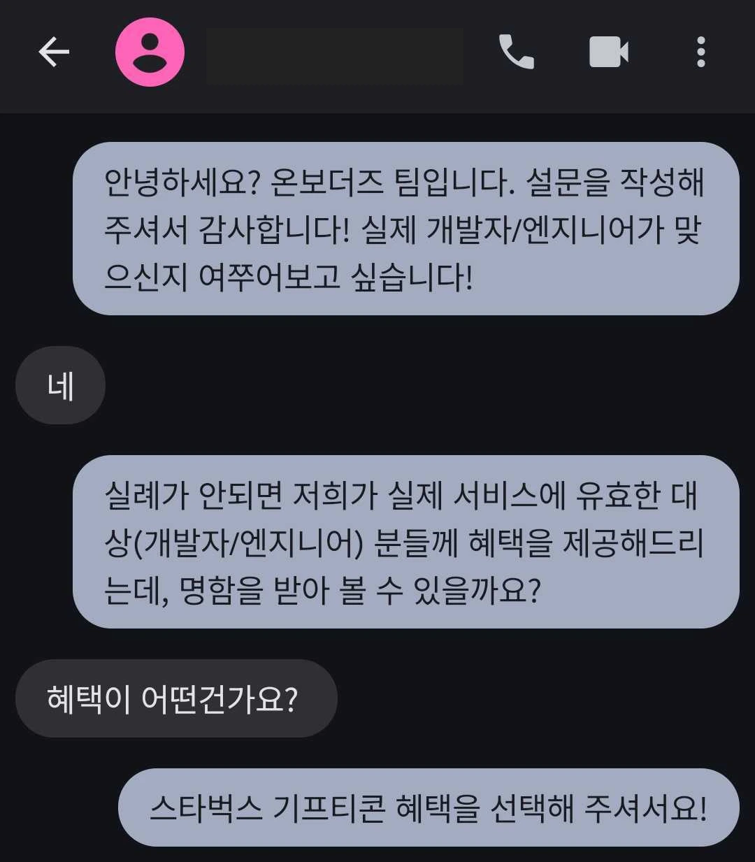 그런데 그로스메이커 팀에서 정확한 기준을 가지고 허수와 허수가 아닌 답변을 걸러주시고, 한 번 걸러진 분들도 우리가 신사업을 통해 만나고자 했던 타겟 고객이 맞는지 한 분씩 유선 통화로 더블체크를 해주셨어요. 덕분에 허수가 대거 유입되었음에도 설문조사 결과는 매우 신뢰할 만하게 도출할 수 있었습니다.