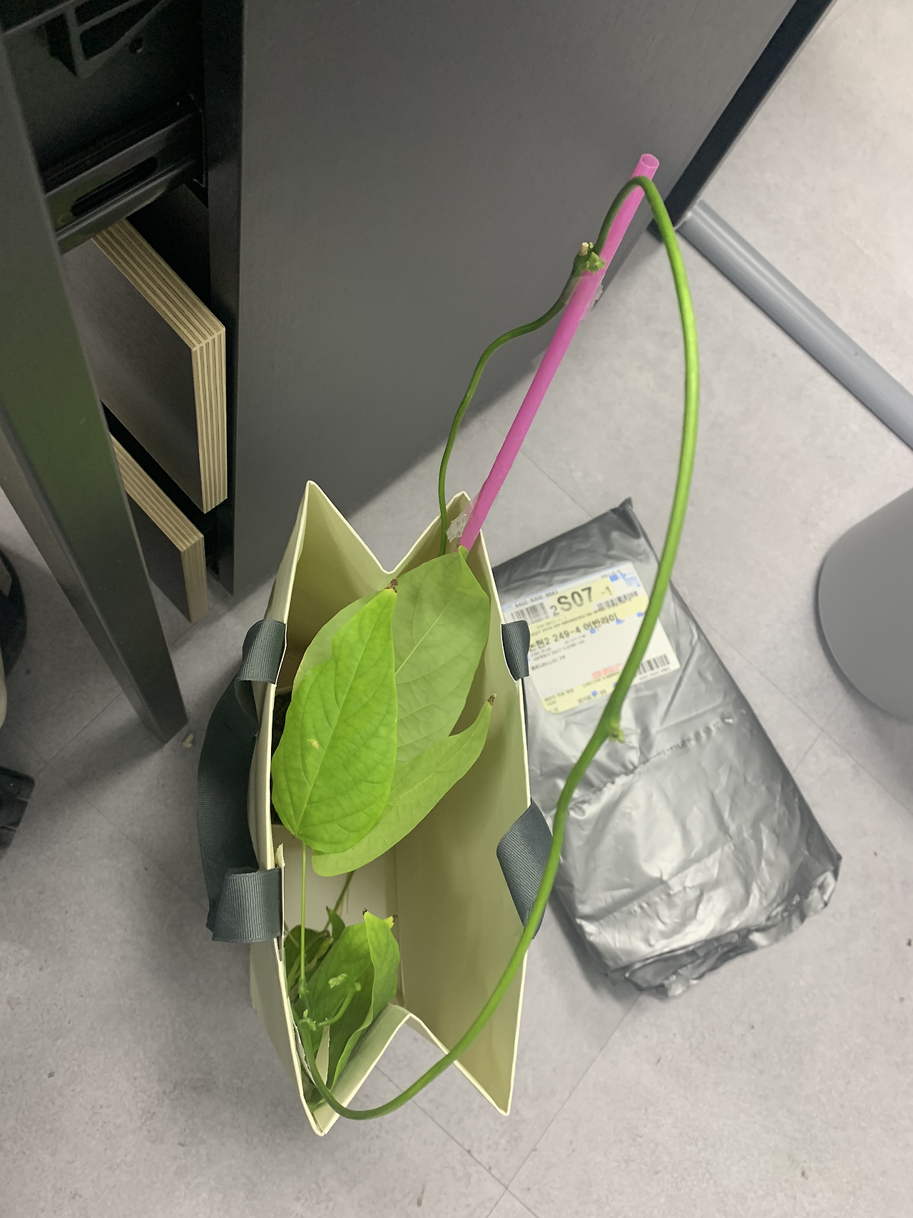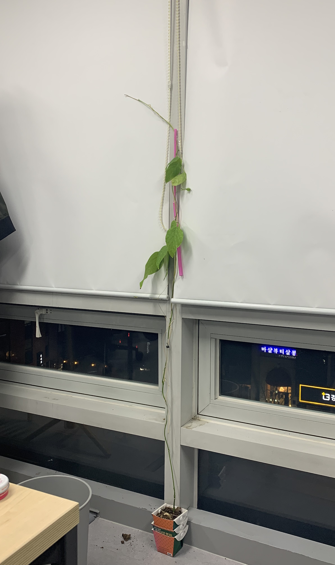 작두콩은 이제 지지대가 없으면 휘청거릴 정도의 높이가 되었다. 빨대와 나무젓가락을 이어 테이프로 칭칭 감아주었다. 출근하면 분무기로 잎사귀를 촉촉하게 적셔주고 화분에 물을 주는 일부터 하루를 시작했다. 예전에는 오자마자 커피를 수혈받는 환자로 하루를 밍기적 밍기적 시작했다면, 이제는 작두콩 관리자이자 재배인으로써 하루를 품격 있게 시작했다. 작두콩은 잭과 콩나무에서 '콩나무'처럼 내 허리 높이 까지 쑥쑥 자랐다.