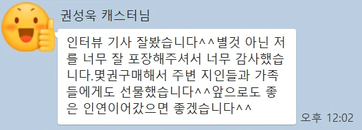 그리고 잡지가 발간된 후 캐스터님께 온 카톡 하나. 인터뷰를 마치고 원본 사진을 보내드리기 위해 연락처를 교환했는데, 그걸 인연으로 이렇게 인터뷰 후기를 보내주신 거였다. 평소 내가 해낸 것으로부터 오는 보람을 갈구하는 스타일이라 하루종일 어깨가 한껏 높아진 것은 덤. 내가 에디터 생활을 못 끊는 이유가 이런 게 아닐까 싶다.