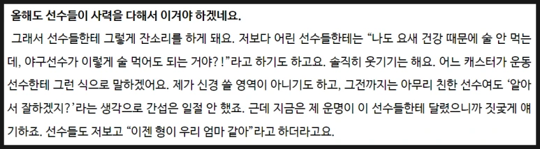 "최강야구는 제게 인생을 건 도박이에요. 프리랜서로 나온 직후에 최강야구 말고는 확실하게 자리를 잡은 게 없는 상황인데, 없어지면 큰일이잖아요. 심지어 시청률이 떨어져서가 아니라, 경기 결과 때문에 폐지되는 거니까 더 미치는 거죠."