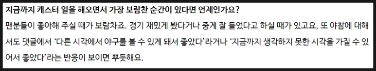 미래에 어떤 캐스터로 기억되고 싶냐고 묻는 내 질문에 대한 정 캐스터님의 답변. 스포츠 현장을 전달하는 과정에서 그가 가장 중요하다고 여긴 덕목은 바로 '재미'였다. 두 달 전 인터뷰에서 권성욱 캐스터가 팬들로 하여금 '야구에 대한 폭넓은 이해'를 할 수 있도록 하는 걸 우선적인 가치로 답했다면, 정용검 캐스터는 야구 중계의 엔터테인먼트적인 요소를 최우선으로 여기고 있었던 것이다.