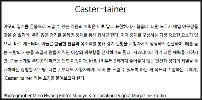 <더그아웃 매거진>에서 비(非) 야구선수들의 이야기를 담아내는 'Inside The Park'는 각양각색의 인물들이 인터뷰이로 선정된다. 그중엔 야구 중계를 맛깔나게 살리는 캐스터들도 인터뷰의 대상이 되곤 하는데, 작년까지만 해도 이분들의 출연이 그다지 자주 일어나는 편은 아니었다. 당장 2023년이 되기 전까지만 해도 마지막으로 본지에 출연했던 SPOTV 김민수 캐스터와의 인터뷰가 2021년 11월이었으니.