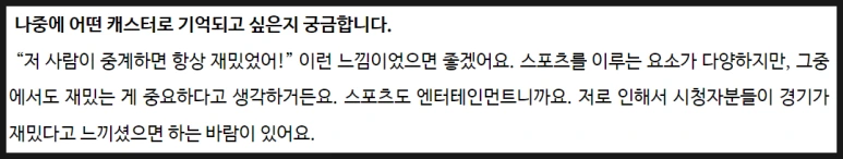 "'저 사람이 중계하면 항상 재밌었어!' 이런 느낌이었으면 좋겠어요. 스포츠를 이루는 요소가 다양하지만, 그중에서도 재밌는 게 중요하다고 생각하거든요. 스포츠도 엔터테인먼트니까요."