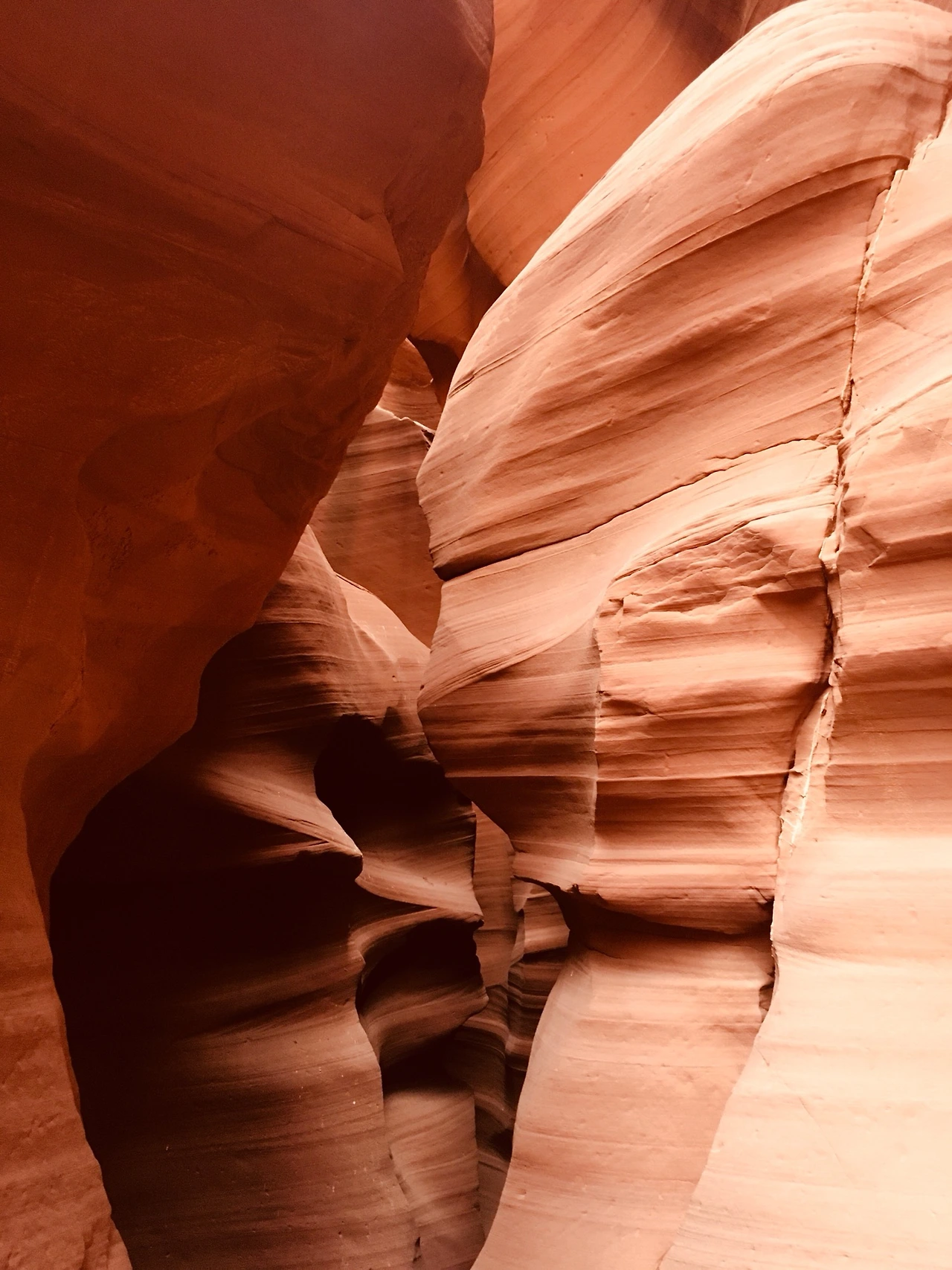 비하인드의 하이라이트는 우리 팀의 빌런들이었다. 앤털로프 캐니언 투어는 한 명의 가이드가 약 10-15명의 관광객을 이끌고 협곡을 지나는 방식이었고 우린 중국인 단체 관광객과 함께 한 팀이 되었다. 영어로 설명하는 가이드에게 중국어로 질문인지, 대답인지를 동시다발적으로 하는 중국인들 열댓 명과 함께 말이다. 그들은 가이드의 지시를 무시하고 맘대로 행동하는 통에 가이드의 표정은 점점 어두워졌고 목소리는 커졌으며 이따금 갈라지기도 했다. 설상가상으로 우리 팀 앞뒤 모두 중국인 단체 관광객이었고 그들끼리 나누는 시끄러운 대화에 우리의 청각 기능이 저하되는 것 같았다. 협곡 사이를 걷는 이 투어는 너비가 넓지 않아 일방통행만 가능하며 15분 간격으로 사람들이 유입되어 한 곳에 오래 머물 수 없다. 즉, 마음에 드는 단독샷을 찍기 위해 치맛자락을 휘날리며 온갖 포즈를 취하는 순간 인터내셔널 진상 여행객이 되는 것이다. 우리의 예상에 한치도 빗나가지 않게 그들은 주저하지 않고 포즈를 취하며 인생 샷에 몰입했다. 인생 샷이 대체 뭐길래.