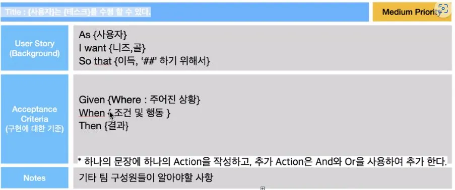 1) 유저스토리(User story) : 피쳐 단위의 주체, 기능, 목적 등을 정의하며, 사이즈에 따라 epic과 유저스토리로 나뉩니다. 아래와 같이 각 기능별 상세한 명세를 한 유저스토리를 작성할 수도 있으나, 유저의 사용 흐름을 파악하기 위해 피그잼을 이용한 간단한 명세도 가능합니다.