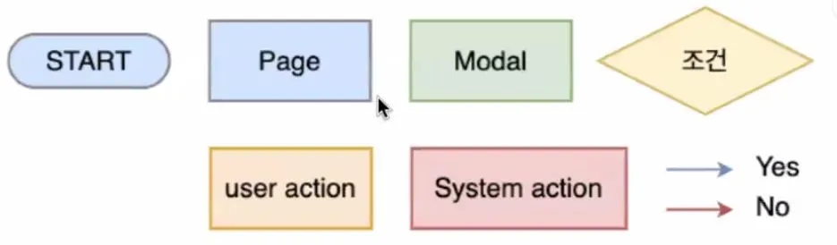 2) 유저플로우(User flow) : 개발팀에서 흔하게 생각하는 유저의 사용 흐름입니다. 개선하기로 하거나, 만들기로 한 해당 부분만의 플로우를 작성하는 것이 대부분이고, 서비스 기능의 크기와 관계 없이 개념들을 논리화하여 만듭니다. 도형으로 각 기능을 명세하고 조건을 표시하기 때문에 도형의 역할을 알고 있으면 좋습니다. 유저스토리와의 차이점을 찾자면, 유저스토리는 일반적으로 pm이 작성을 완료하나 유저플로우는 개발자가 작성을 하는 경우도 많습니다.