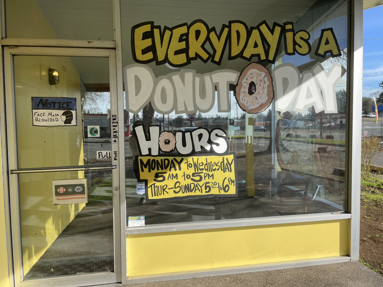깨진 창문은 그림으로 때우는 도넛 가게라니