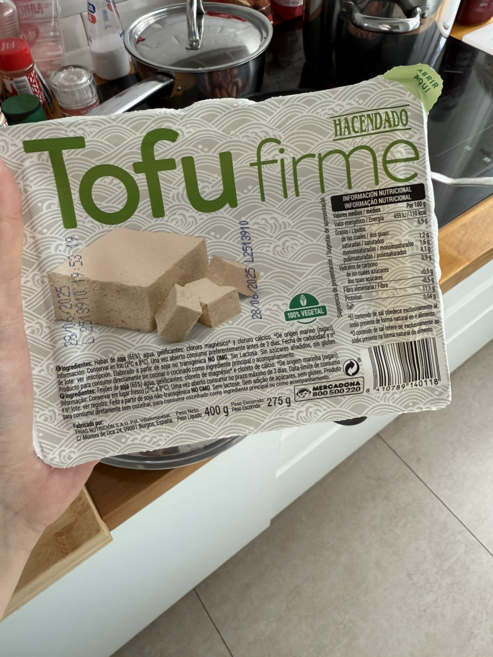 Mercadona라는 현지 마트에 두부를 판매한다. 단단한 두부인데 요리하기 적합하다.