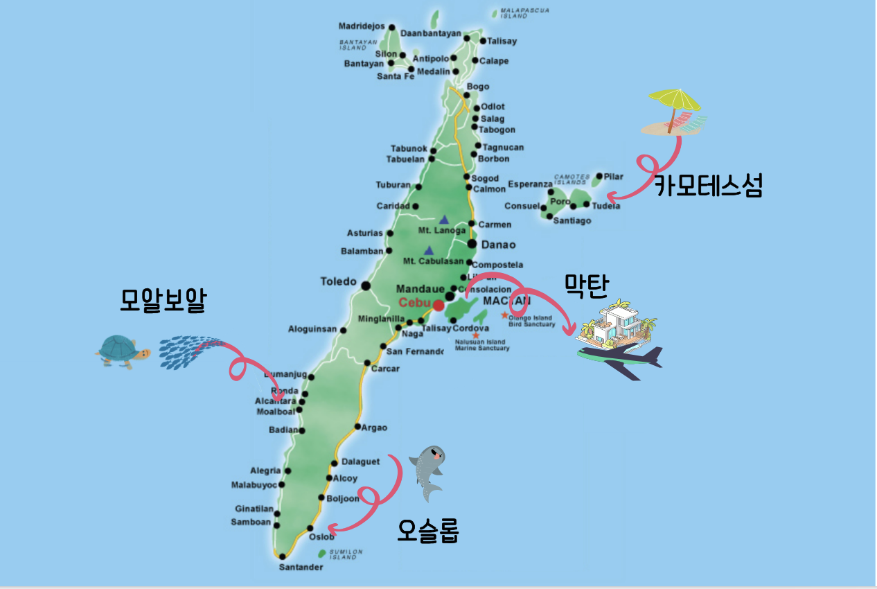 세부 지도 위에 우리가 방문할 지역을 찍어보면 북쪽을 제외하고 섬을 동 > 남 > 서쪽 방향으로 돌고, 배를 타고 아직 개발이 덜 된 만큼 자연이 아름다운 카모테스섬으로 이동하는 것이다.