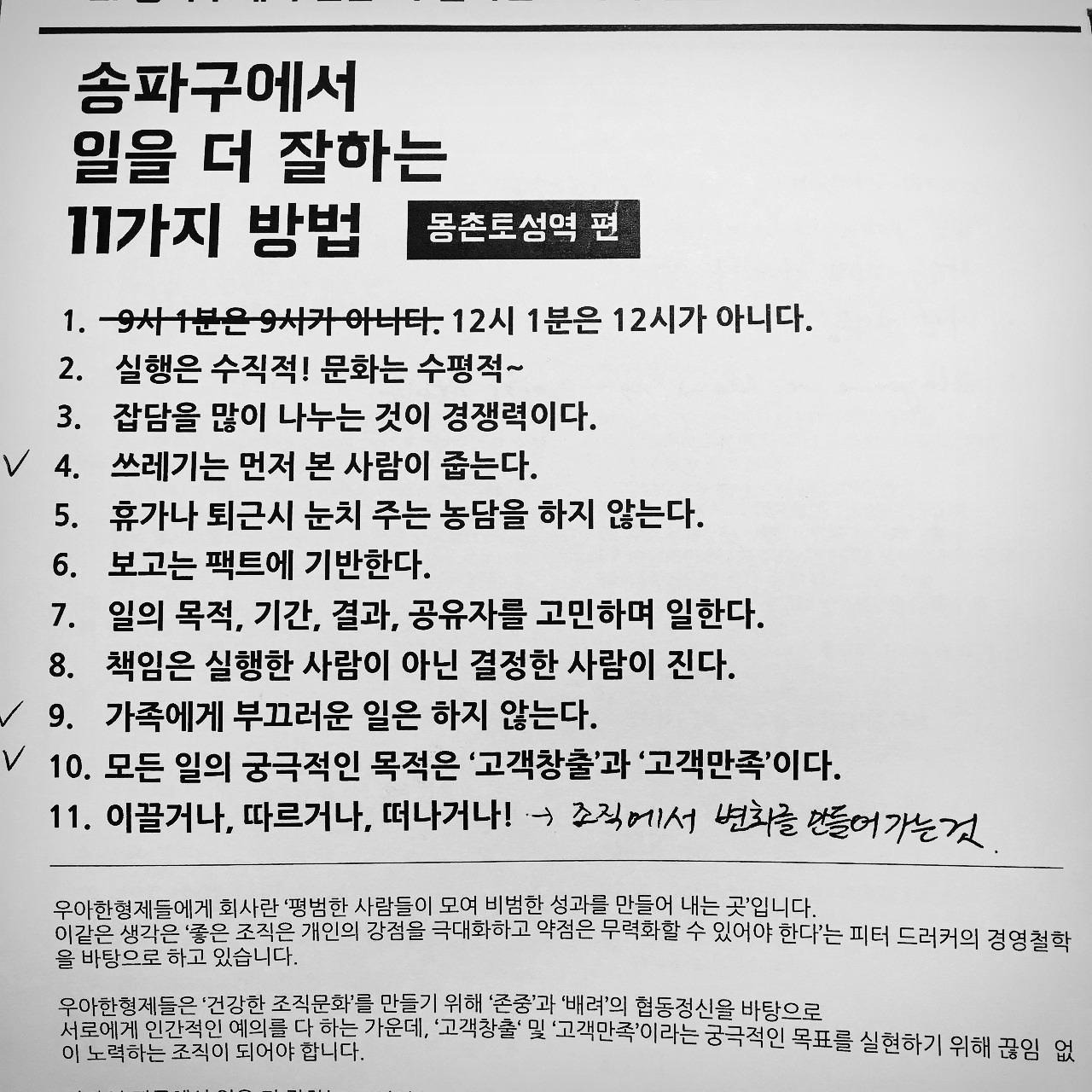 최근에 이직한 우아한형제들은 조직문화에 투자를 많이 하고 특별한 문화를 가진 회사로 알려져 있습니다. 실제로 입사 첫날부터 신규 입사자 교육 중에도 배민다운 조직문화에 대해 공유하고 고민하는 시간이 많았고, 특히 조항 하나하나 마다 어떤 고민들과 시행착오가 담겼는지에 대한 이야기를 듣는 시간은 굉장히 뜻깊었습니다. 100명을 기대하는 회사가 준비하는 조직문화와 3,000명을 기대하는 회사가 준비하는 조직문화는 당연히 다를 것입니다. 나중에 기회가 된다면, 조직원으로서 실제 경험한 '송파구에서 일을 더 잘하는 방법 11가지'를 나눠보도록 하겠습니다.