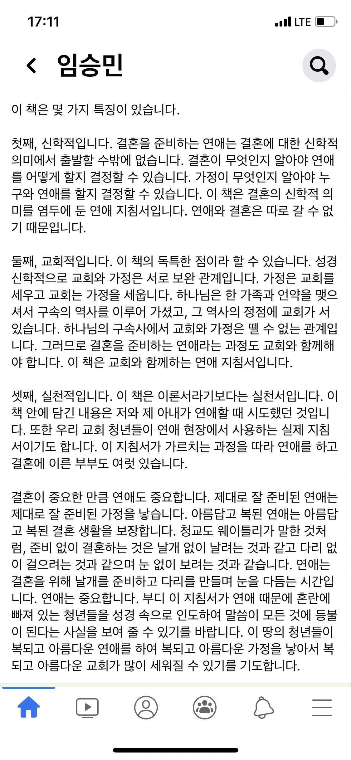 연애는 결혼으로 가는 과정이다. 당연히 만나자마자 우리 결혼하자는 아니지만, 결혼이라는 종착점을 보면서 연애를 할 수 있어야 한다. 따라서 진지하게 결혼에 대해 깊게 고민해보면 좋고 기독교적인 결혼관까지 생각해본 사람이면 너무 좋을 것 같다. 결혼 생각이 전혀 없다거나, 비혼주의자인 사람과는 애초 연애를 하기 힘듦.