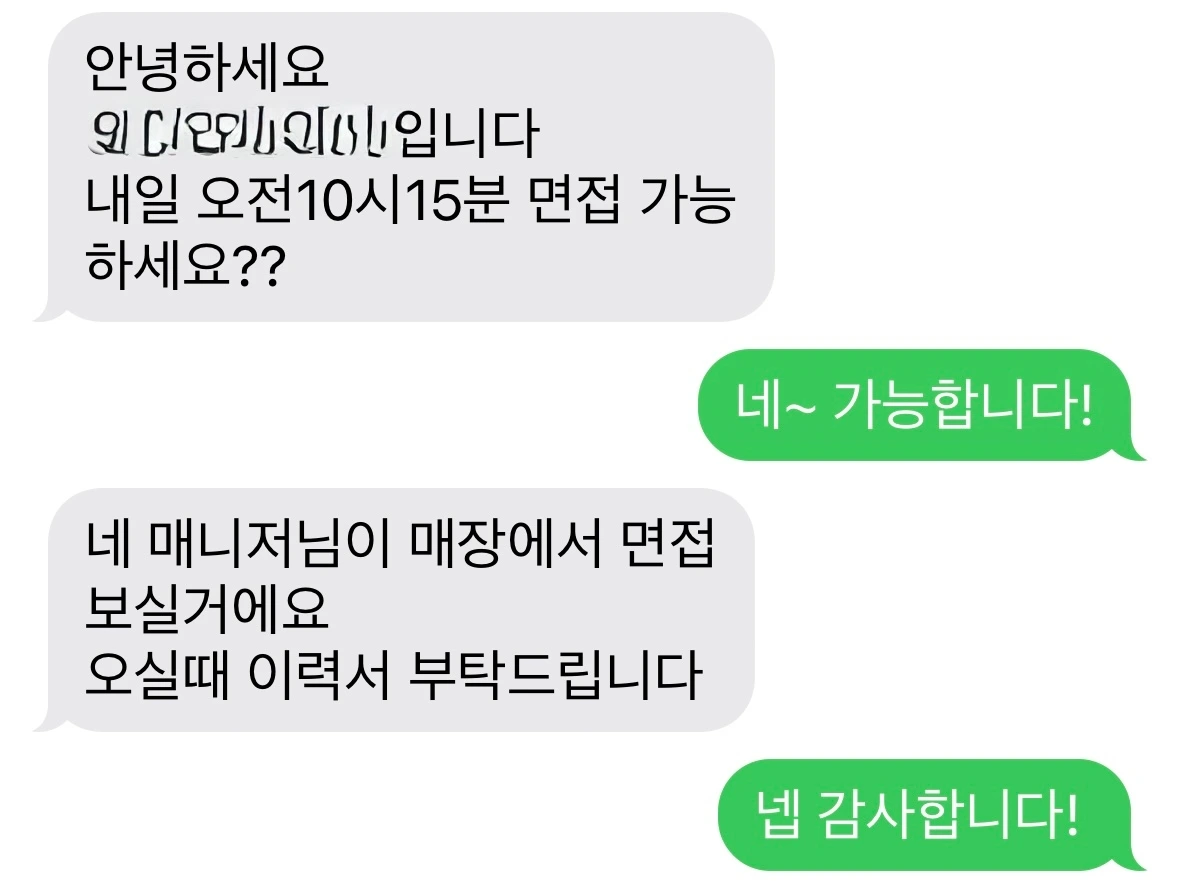 사장 “안녕하세요 아까 면접 본 편의점인데~ 이번 주 토요일부터 와주시면 될 것 같아요.“