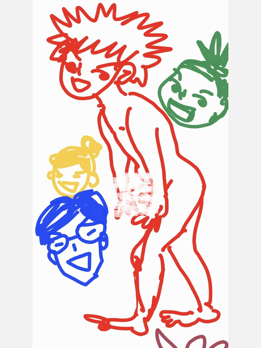 그날도 실오라기 하나 걸치지 않고 해맑게 웃고 있는 삐죽머리 남자 캐릭터를 그려줬다. (너무 선정적?이라 여기에는 자체 모자이크 버전을 올린다.)그런데도 아이는 '더, 더, 더 챙피한 거'를 주문한다.