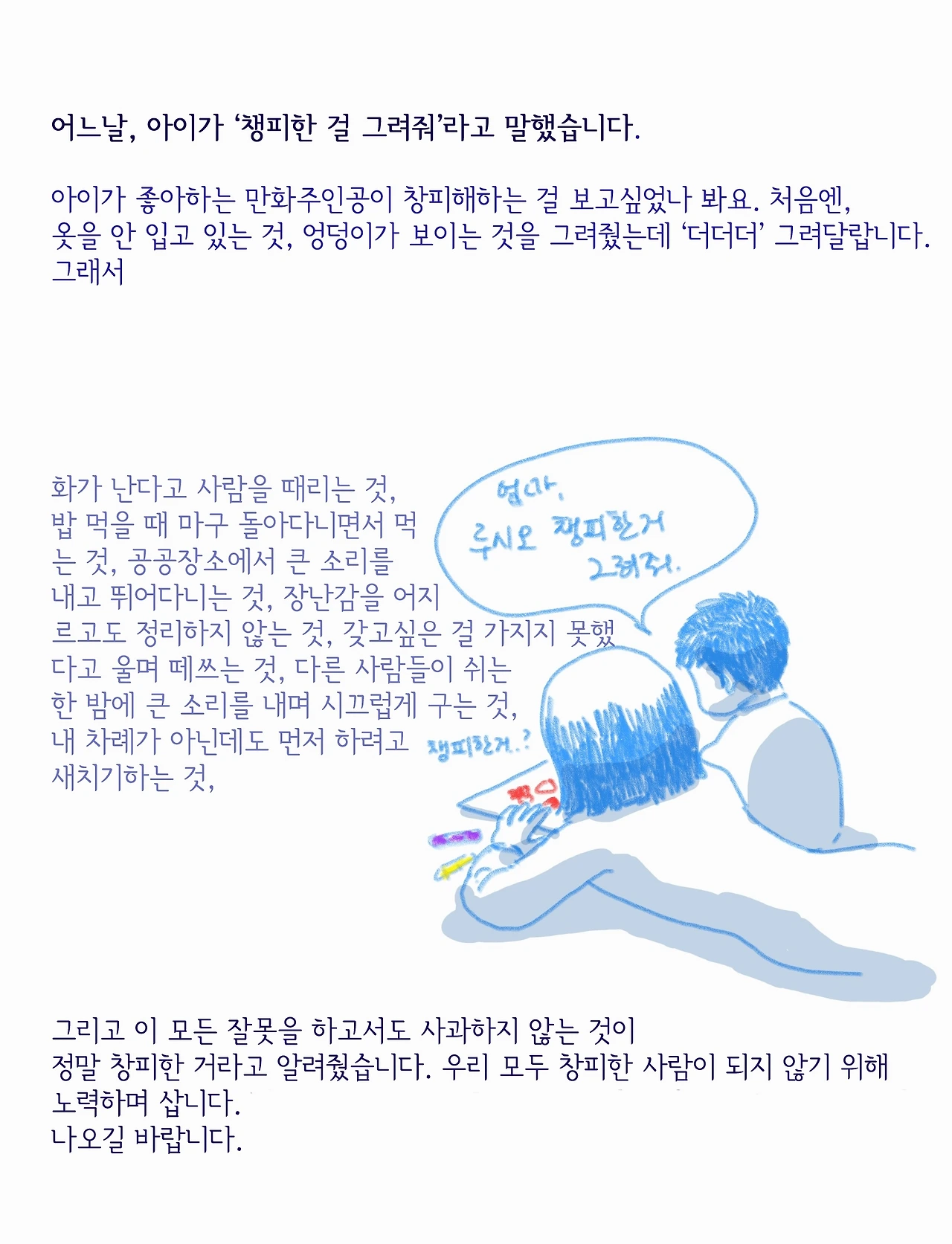 만화에선 언제나 용감하게 악당을 물리치는 유쾌한 남자주인공이 여기에선 자기가 그리는 대로 한없이 창피해지는 걸 보고싶은 걸까. 의도를 알 수 없는 아이 질문에, 나는 '노출'보다 창피한 게 뭔지 고민해야 했다. 그리고 세상 교육적인(?) 나는 이 기회를 놓치지 않고 말했다. "음..... 더 챙피한 건 이런 거지. 화난다고 남을 막 때리는 거, 밥 먹을 때 돌아다니면서 먹느라 밥을 다 흘리는 거, 사람들 다 있는 데서 큰 소리로 장난치고 뛰어다니는 거, 장난감 어지르고 안 치우는 거, 갖고싶은 장난감 안 사준다고 막 울고 떼쓰는 거, 남들 다 자는 깜깜 밤에 큰 소리로 떠드는 거, 자기 차례 아닌데 먼저 하려고 새치기 하는 거." "엄마 새치기가 뭐야?" "차례로 줄 서있는데, 늦게 왔으면서 저 앞에 서서 먼저 하려고 하는 거지." "나쁜 거네." "그치? 근데 이렇게 해놓고 다른 사람한테 미안하다고 사과 안 하는 게 제일 챙피한 거야."