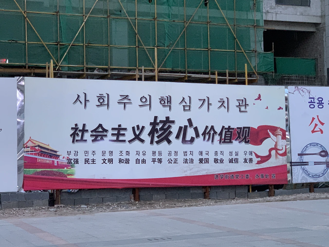중국은 공산주의 국가답게 곳곳에 선전 문구가 적혀있으며 심지어 종종 핸드폰 문자메시지로도 날아오곤 한다. 한자로 접했을 땐 '여긴 중국이니까'하며 그러려니 했던 내용들이 시내 한복판에 한글로 떡하니 적혀있는 걸 보니 순간 기분이 이상했다.