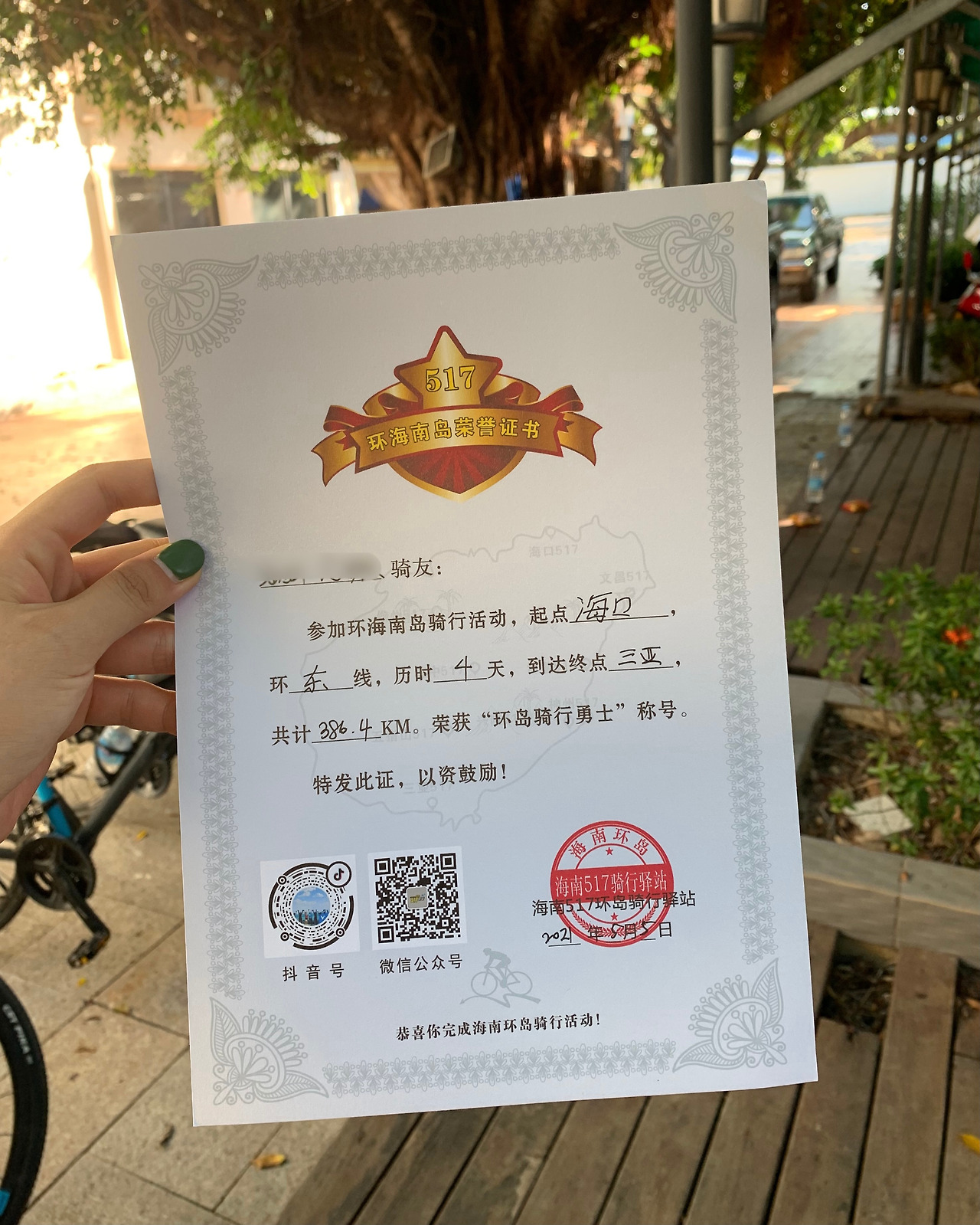 첫째 날 99km, 둘째 날 63km, 셋째 날 103km, 마지막 날 105km, 총 370km의 대장정이 드디어 끝났다. 마지막 날 일행들의 도움과 응원이 없었더라면 아마 포기했을지도 모른다. 그날 밤, 싼야三亚를 떠나는 비행기를 기다리며 그룹 위챗 방에 다시 한번 고마움의 메시지를 남겼다.