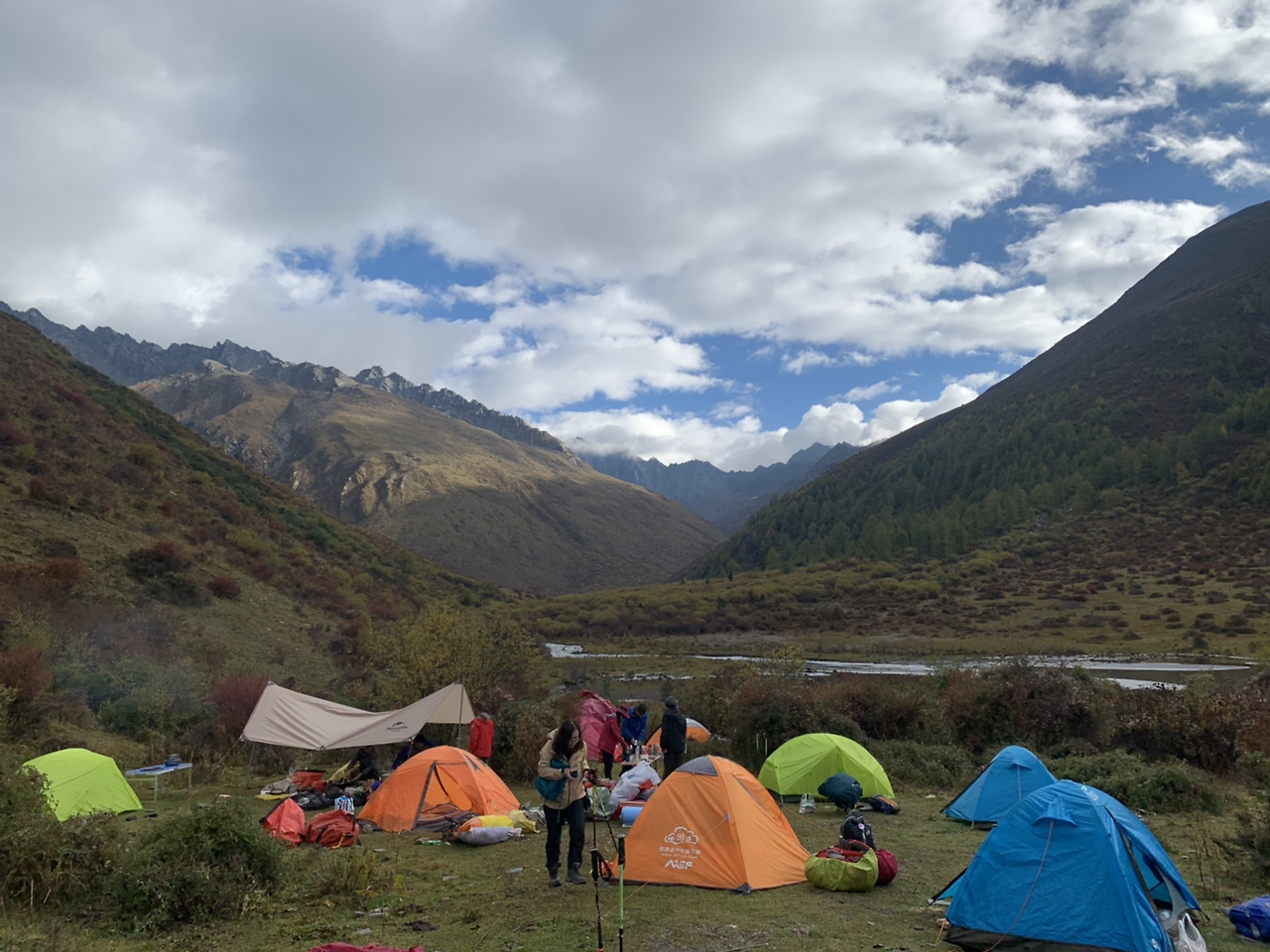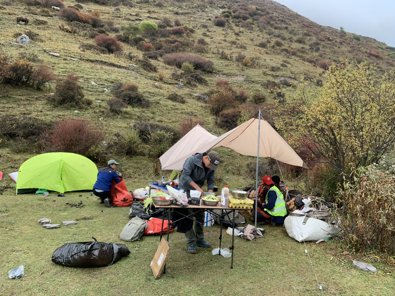 오후 4시쯤 해발 3800m의 야영지에 도착했다. 이미 도착한 다른 팀들은 맞은편에 텐트를 설치하는 중이었고, 우리 팀도 근처 평평한 곳에 자리 잡아 야영할 준비를 시작했다. 말에 싣고 온 짐을 넘겨받아 짐 정리를 하고 쉬는 동안 가이드는 저녁 준비에 여념이 없다. 물이 끓고 보온병에 뜨거운 물을 받아 몸을 따뜻하게 녹인 후 저녁 식사를 기다리며 카드 게임으로 무료함을 달래보기도 한다. 고산지대의 쌀랑한 날씨가 웃음으로 제법 훈훈해질 때쯤 완성된 저녁 식사는 그야말로 그 무엇과 비교할 수 없을 만큼의 '만찬'이었다. 산 아래였다면 그저 평범했을 중국식 한 끼 식사는 4년 중국 생활 중 최고의 식사가 되었다.