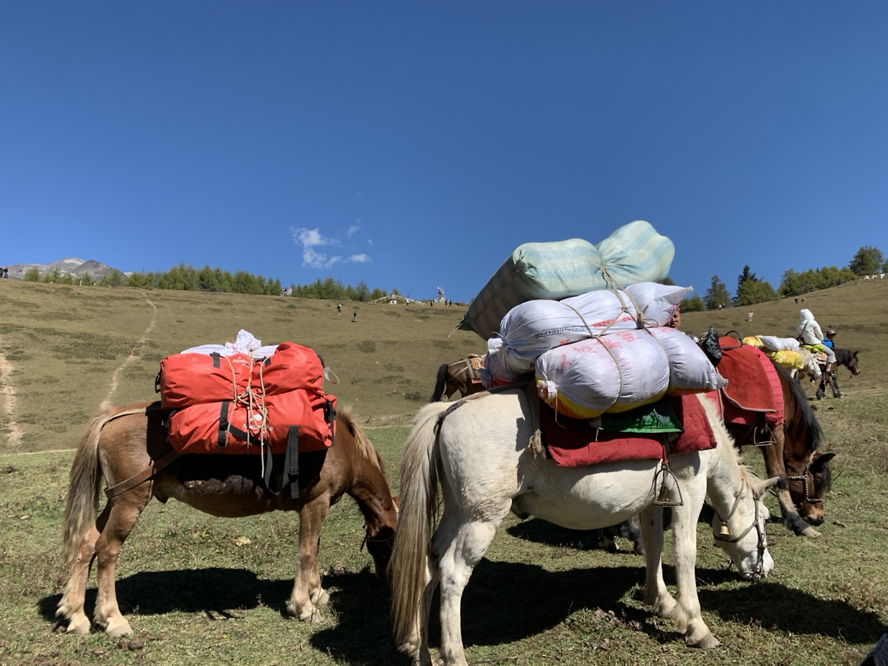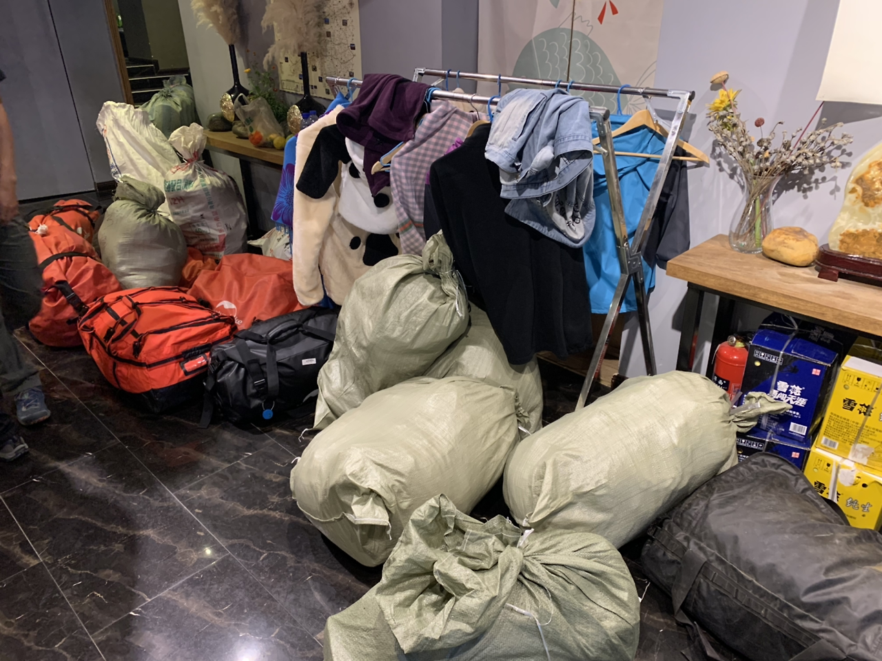 아침에 일어나 국수를 먹는 것으로 트래킹 첫째 날 일정이 시작되었다. 걸어야 할 거리가 제법 긴 하루이므로 든든하게 아침을 먹고 각종 건식도 다시 한번 확인한다. 산에서 2박 3일 동안 사용할 각종 짐들은 전날 밤 驼包(말이 싣고 가는 큰 짐가방. 직역하면 ‘낙타 가방’)에 넣어 말에 실어 보내고, 당일 사용할 짐만 메고 간다.
