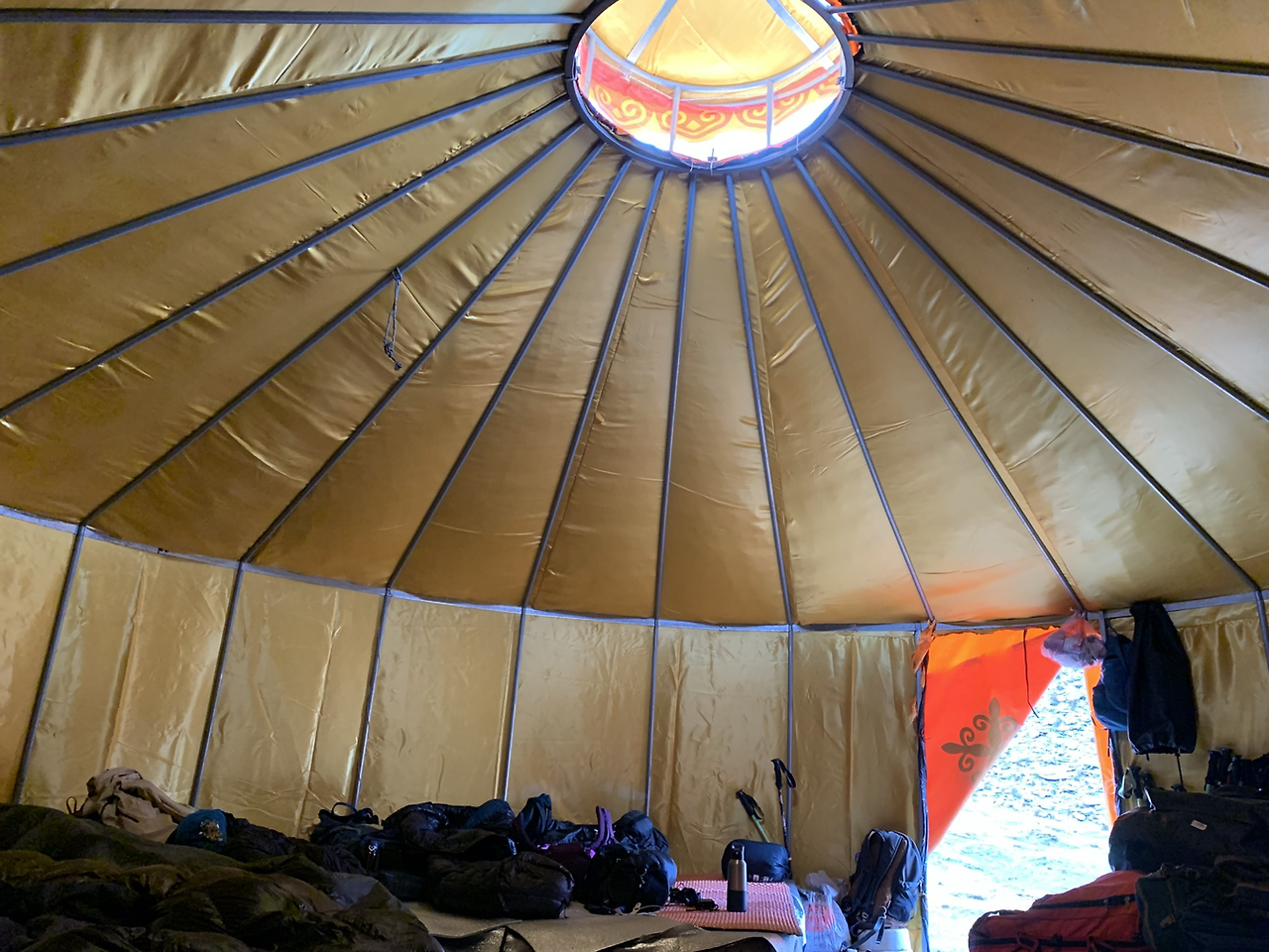 트래킹 둘째 날 아침. 가볍게 아침을 먹은 뒤 짐을 꾸려 말에 먼저 실어 보냈다. 어제 고산병으로 힘들어했던 팀원 한 명은 고민 끝에 이후 일정을 포기하고 먼저 내려가서 쉬기로 결정했다. 아쉽지만 건강이 우선이기에 산 밑에서 다시 만나기로 하고 그녀를 보냈다. 이 날은 이동 거리가 멀지 않기에 캠프 근처 경치 좋은 곳에서 단체 사진과 각종 개인 사진을 찍으며 여유로운 오전을 보낸 뒤 트래킹을 시작했다. 400m만 올라가면 되니까 별 거 아닐 거라는 오만한 생각은 급경사를 만나자 쏙 들어갔는데, 가이드는 '정상 등반에 비하면 아무것도 아니다'며 힘들다고 징징대는 우리에게 겁을 주었다. 거친 숨을 내쉬며 4200m 야영지에 도착하니 이미 설치된 몽골식 게르가 우리를 기다리고 있었다. 해발고도가 더 높아진 만큼 바람이 세고 춥기 때문에 텐트보다 훨씬 따뜻하고 튼튼한 게르에서 자기로 한 것.(물론 건너편엔 텐트에서 자는 팀도 있었다.)