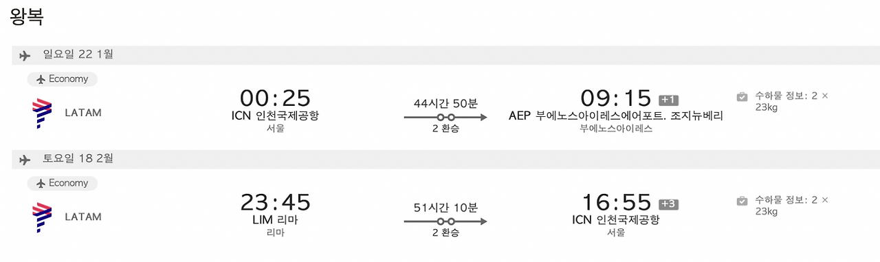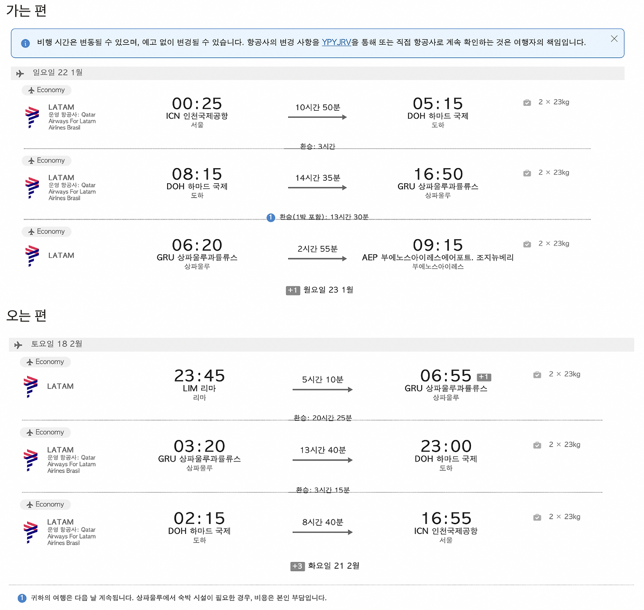 갈 때 : 인천 - 도하(카타르) - 상파울루(브라질) - ((스탑오버)) - 부에노스아이레스 (아르헨티나)