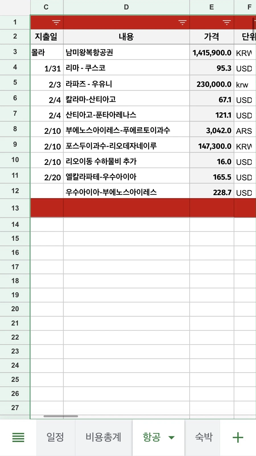 제가 여행한 시기는 남미 여행의 최고 성수기라고 하는 1~2월이었고, 코로나 이후 물가 폭등 및 유가 상승 이후의 시기이다 보니 비용이 좀 들었습니다. 우선 항공권만 해도 2번 경유하는 저렴한 항공편을 이용했는데도 불구하고 180만원 들었네요. 여행을 고민하는 동안 동일한 항공편이 50만원 정도가 확 올라버려서 그 비용이 조금 아까웠어요. 그리고 남미는 땅이 워낙 길고 광활하다 보니 도시 간 이동이 정말 난이도가 높아서, 장거리 이동엔 항공편을 주로 이용하여 이 부분이 비용 많이 들었네요(전체 비용의 36%). 그 외에도 남미는 워낙 여행지 자체의 난이도도 있다보니, 예방 접종 및 준비물 구매 등에도 비용이 쓰였답니다. 그래서 결론적으로 전체 여행 비용은 700만원 중반 정도 들었네요.