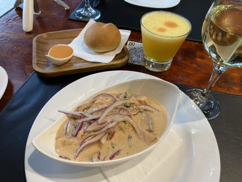 그리고 하루를 마무리하기 위해 숙소 주인아주머니의 추천 식당으로 향했다. 이름은 Jose Antonio de la Patagonia. 먼 거리 이동에 대한 셀프 보상으로 맛있는 음식을 잔뜩 시켰다. 바질 연어구이 리조또와 세비체 그리고 피스코 사워와 화이트 와인 한잔, 혼자였지만 거의 두 명이서 먹어야 할 양을 시켰다. 제일 먼저 식전 빵과 화이트 와인이 나왔다. 식전빵에 곁들이는 소스로 아주 매운 소스가 나와서 놀랐다. 얼굴이 뜨거워질 정도로 매운 소스라 조금만 맛보고 놓아주었다. 와인으로도 매운맛에 놀란 마음을 추슬렀다.