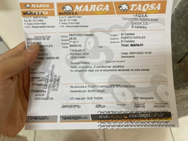 짐을 간단히 풀고, 이곳에 방문한 목적인 토레스 델 파이네 투어를 예약하러 시내로 나갔다. 주인아주머니께 투어 예약할 수 있는 곳을 물었는데, 스페인어 설명이었지만 종이 지도와 접목시키니 다행히 느낌적인 느낌으로 이해할 수 있었다. 역시나 10~15분 정도를 걸으니 동네의 번화한 길목이 나왔고 나는 제일 먼저 보이는 투어사에서 토레스 델 파이네 국립공원 투어를 예약했다. 국립공원 투어 말고 직접 산에 오르는 투어도 있는데, 아직 몸 컨디션이 100% 는 아니어서 공원 투어만 신청했다. 아쉽게도 국립공원 입장료는 별도였는데, 운 좋게 남미 여행 카톡방에서 정가보다 조금 저렴하게 구할 수 있었다.(남미 여행자에게 남미 여행 카페 가입과 카톡방 참여를 매우 권장한다)