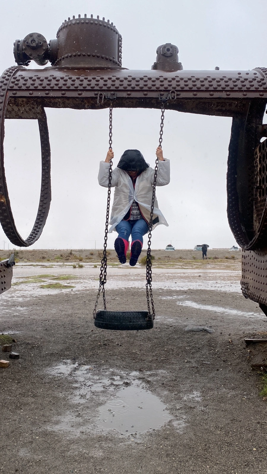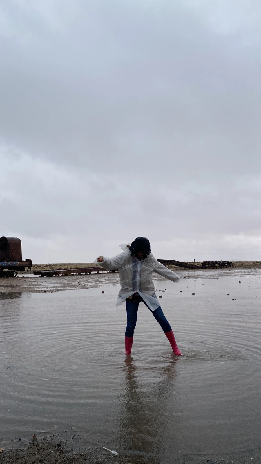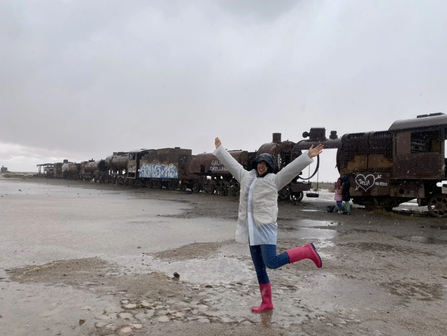 날이 안 좋은 걸 알면서도 떠나는 투어 멤버라 다들 체념한 듯 보였고 ‘뭐 어떻게든 되겠지~’의 마인드라 오히려 좋았다. 한껏 쳐질 수 있는 분위기였지만 그래도 언제 또 비가 왕창 오는 우유니에 오겠나 생각하며 긍정적으로 상황을 받아들이려고 했던 것 같다. 약간의 대기 시간을 지나 각자 사이즈에 맞는 장화를 신고 투어 차량이 출발했다. 약 10~15분 정도 이동 후 처음 도착한 곳은 기차가 덩그러니 있는 포토스팟이었다.