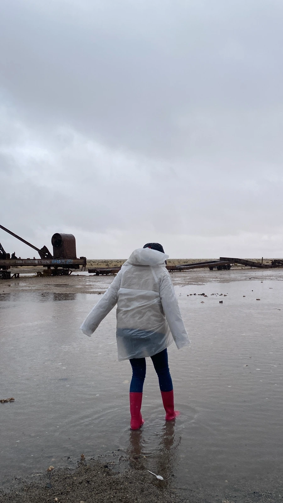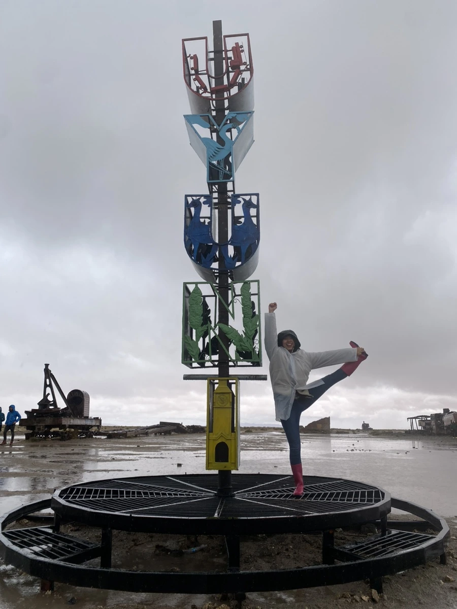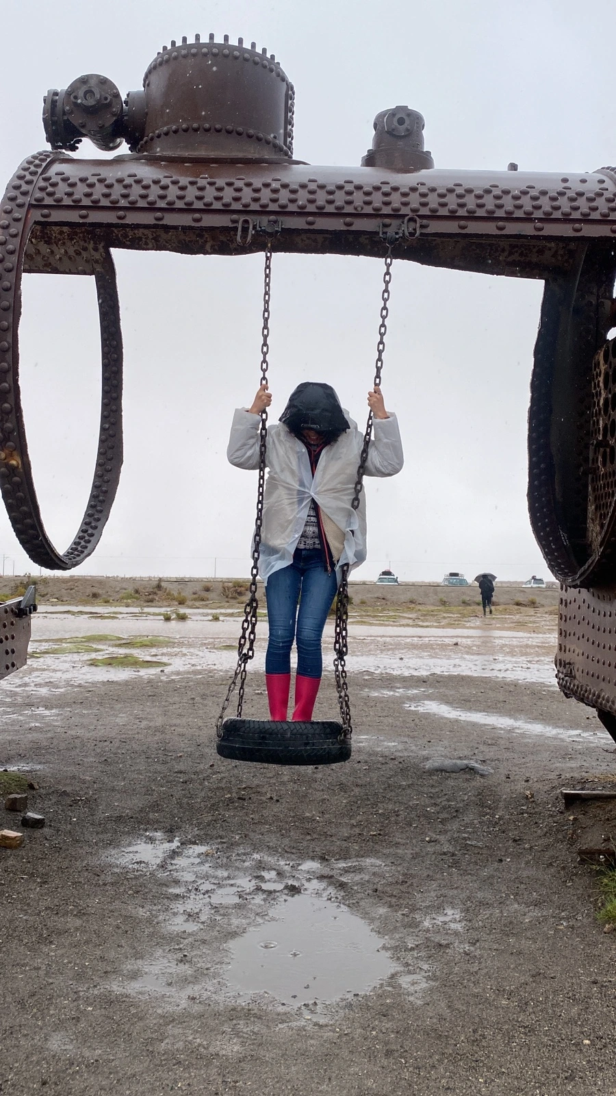 날이 안 좋은 걸 알면서도 떠나는 투어 멤버라 다들 체념한 듯 보였고 ‘뭐 어떻게든 되겠지~’의 마인드라 오히려 좋았다. 한껏 쳐질 수 있는 분위기였지만 그래도 언제 또 비가 왕창 오는 우유니에 오겠나 생각하며 긍정적으로 상황을 받아들이려고 했던 것 같다. 약간의 대기 시간을 지나 각자 사이즈에 맞는 장화를 신고 투어 차량이 출발했다. 약 10~15분 정도 이동 후 처음 도착한 곳은 기차가 덩그러니 있는 포토스팟이었다.