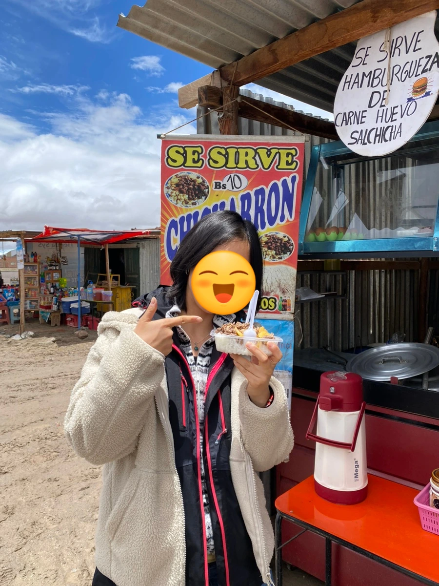 비 오고 흐리던 날씨는 거짓말처럼 쨍하게 맑아졌고 한껏 들뜬 마음으로 소금사막까지 이 날씨가 유지되기를 다시 한번 간절히 기도했다. 설레는 마음을 안고 여러 종류의 소금 결정들과 포장된 소금이 가득한 소금 가게부터, 판초를 파는 가게, 여러 남미스러운 용품들을 파는 가게, 식음료를 파는 가게들을 구경했다. 마음에 드는 판초가 있다면 사진용으로 잠깐 쓰더라도 사볼까 싶었는데 그렇게까지 마음을 사로잡는 제품은 없었다. (라파스의 마녀시장이 훨씬 종류도 많고 예쁜 디자인도 많으며 가격도 훨씬 저렴하다)