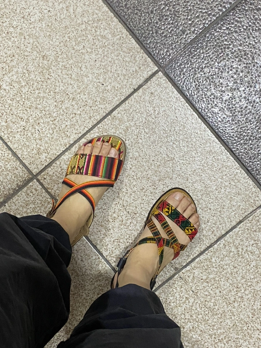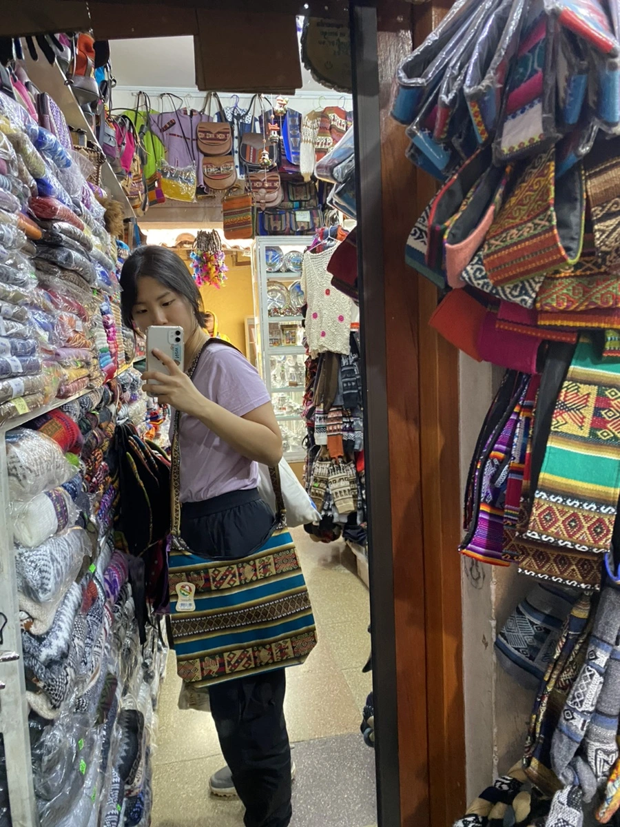 거리에서 우연히 발견한 액세서리 노점상에서는 꽤 괜찮은 목걸이와 귀걸이를 발견해서 이것저것 골라 담았다. 가게에서 파는 것보다 훨씬 저렴하고 빈티지해서 마음에 들었다. 이어서 처음 코차밤바에 왔을 때 여러 작은 소품점, 상점이 있는 골목을 봐뒀었는데 그곳에 다시 가서 한눈에 봐도 남미 느낌이 팍팍 나는 원색의 알록달록한 샌들과 가방을 구경했다. 원래는 소소하게 몇 개만 사려고 했었는데, 보다 보니 사고 싶은 게 많아졌다. 그렇지만 아직 여행이 다 끝난 것도 아니고 앞으로 더 사고 싶은 게 있을 수도 있으니 가방 하나와 샌들 하나, 액세서리 몇 개 더 구매하고 짧고 굵은 쇼핑을 마쳤다.