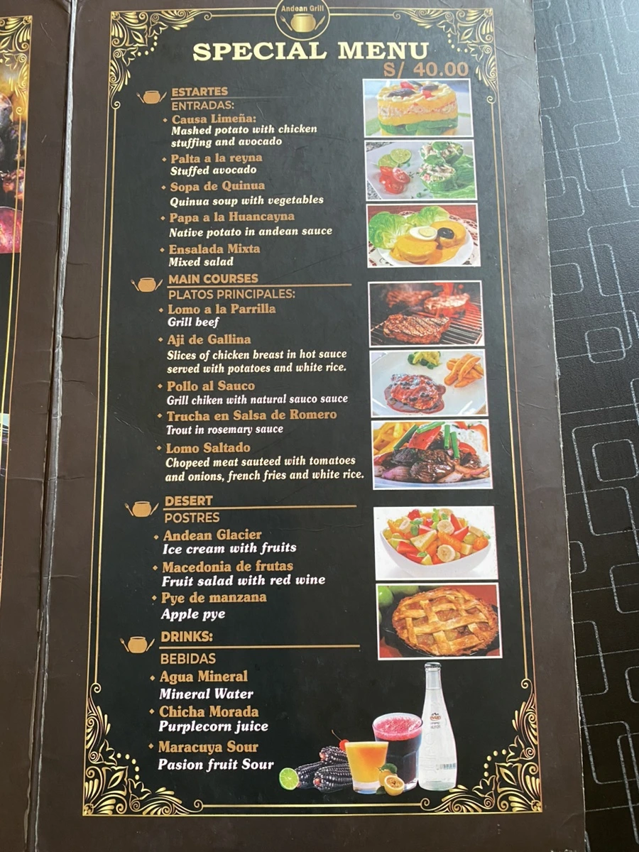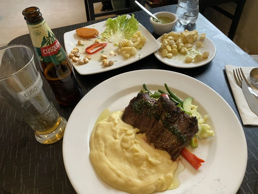 남미에서 소울푸드가 된 세비체도 시켰다. 양은 역시나 아주 많았고, 분명 에피타이저 인 것 같았는데 먹다보니 이미 배가 많이 불렀던 것 같다. 그 상태로 또 알파카 스테이크를 먹었는데, 양고기처럼 알파카 특유의 향이 조금 있었지만 용인할 수 있는 정도였다. 훈연한 향도 있었고 부드럽고 쫄깃하니 맛이 좋았다. 쿠스코에 간다면 한 번쯤 먹어볼만 하겠다고 생각했다. 그런데 양은 정말 너무 많았고, 많았다고 하면서 또 디저트로 케이크를 시켰다. 코스처럼 [에피타이저 - 메인 - 디저트] 이렇게 세트로 구성된 메뉴였고 디저트는 배가 부르기도 하고 맛도 그냥 그래서 거의 다 남겼었다.