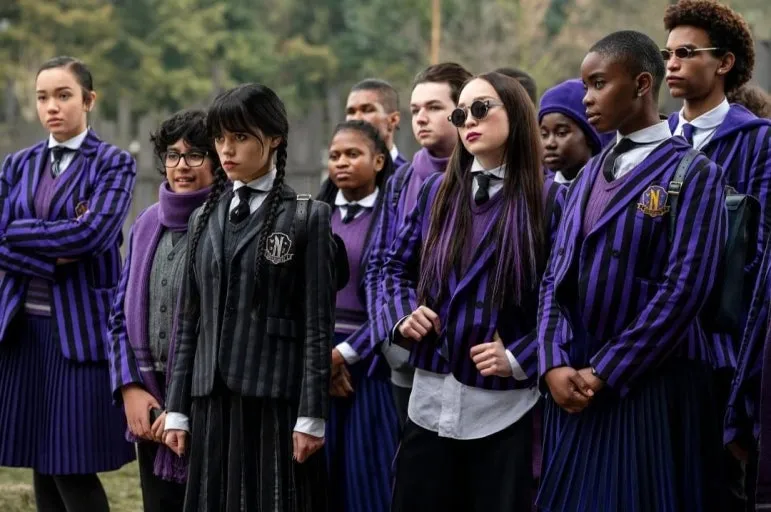 또 하나 선명하게 다가온 건 교복의 색이었다. 화면 속 학생들 대부분은 보라색 교복을 입고 있었다. 그런데 웬즈데이만 홀로 검은색 교복을 입고 서 있었다.